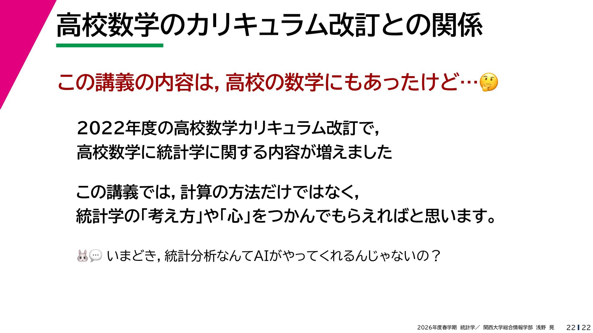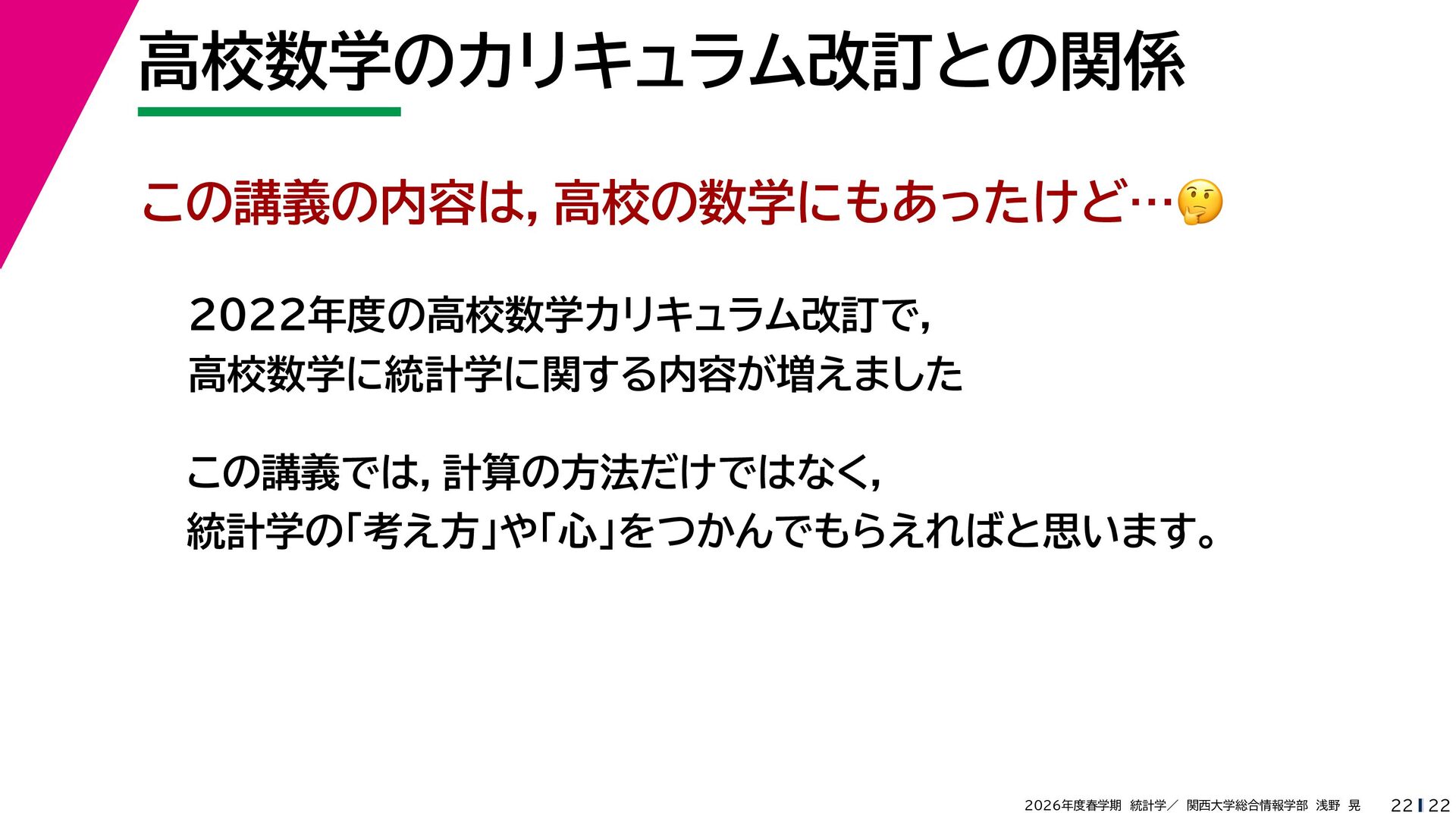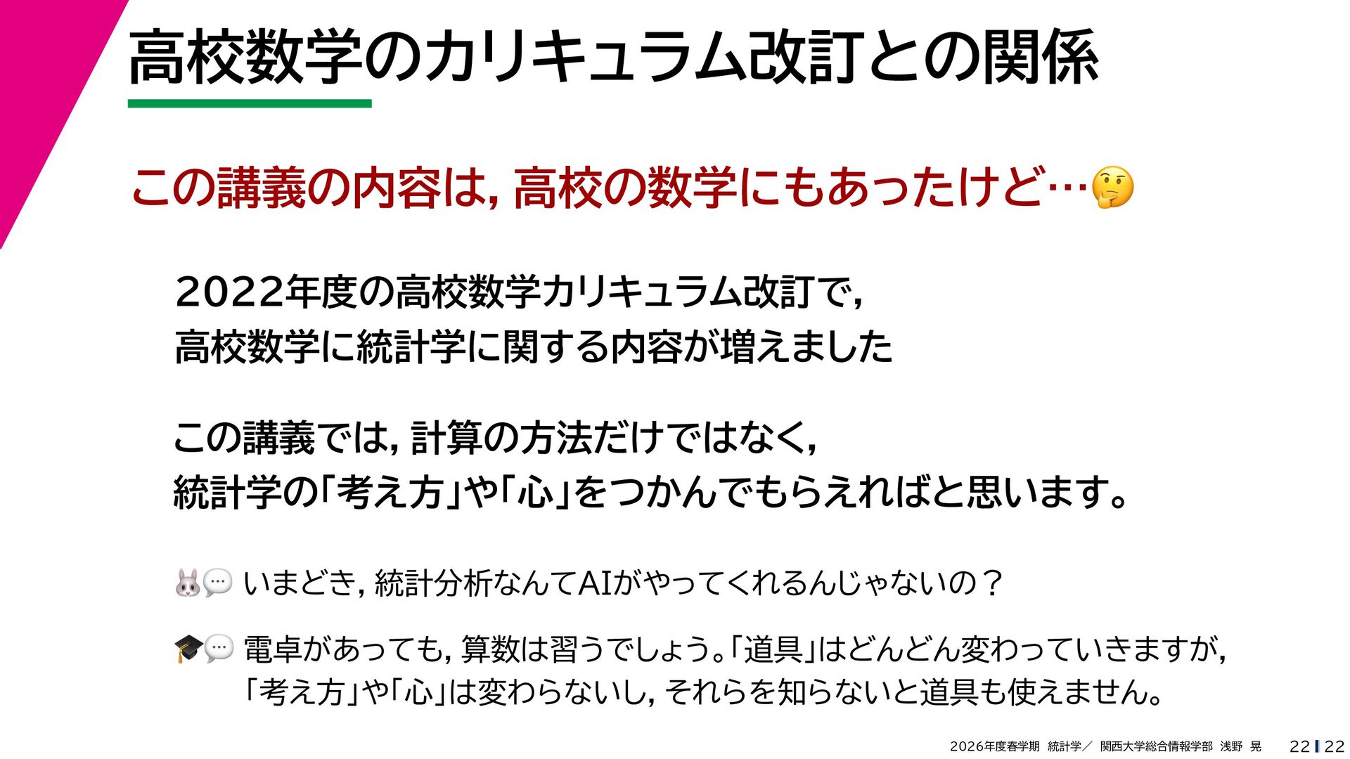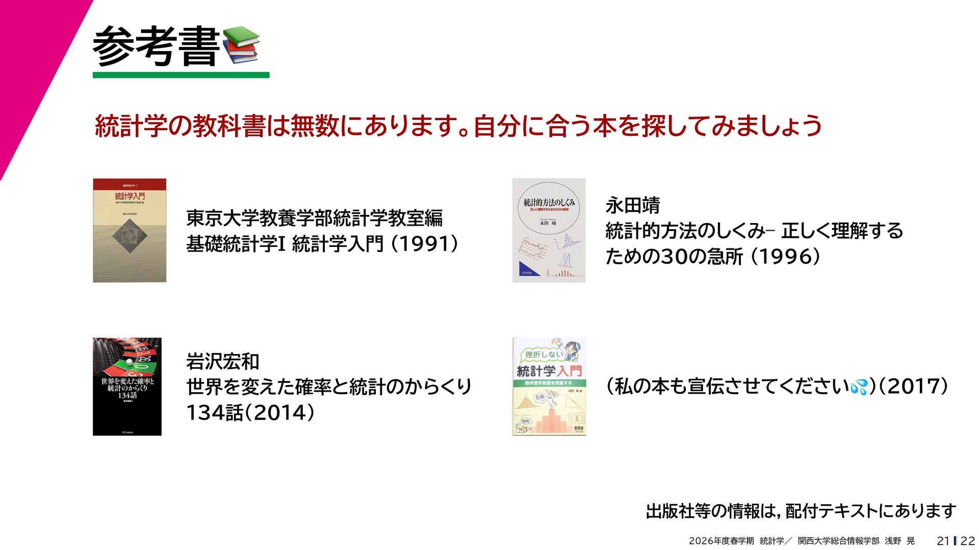 7. 22 2026年度春学期 統計学/ 関西大学総合情報学部 浅野 晃 参考書📚📚 21 東京大学教養学部統計学教室編 基礎統計学I 統計学入門 (1991) 出版社等の情報は,配付テキストにあります 永田靖