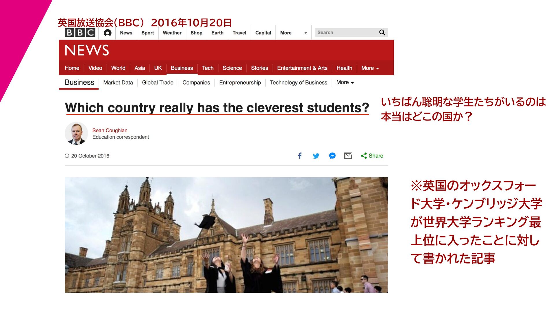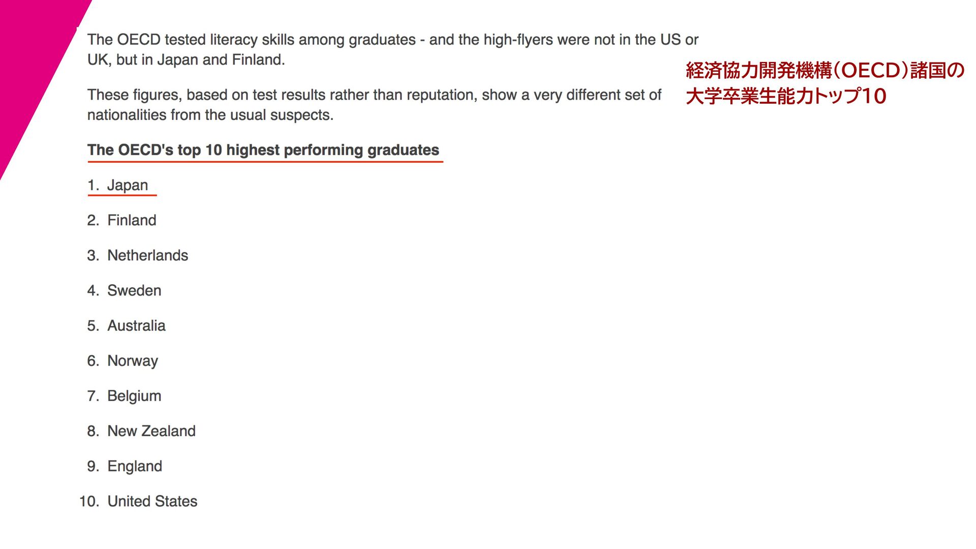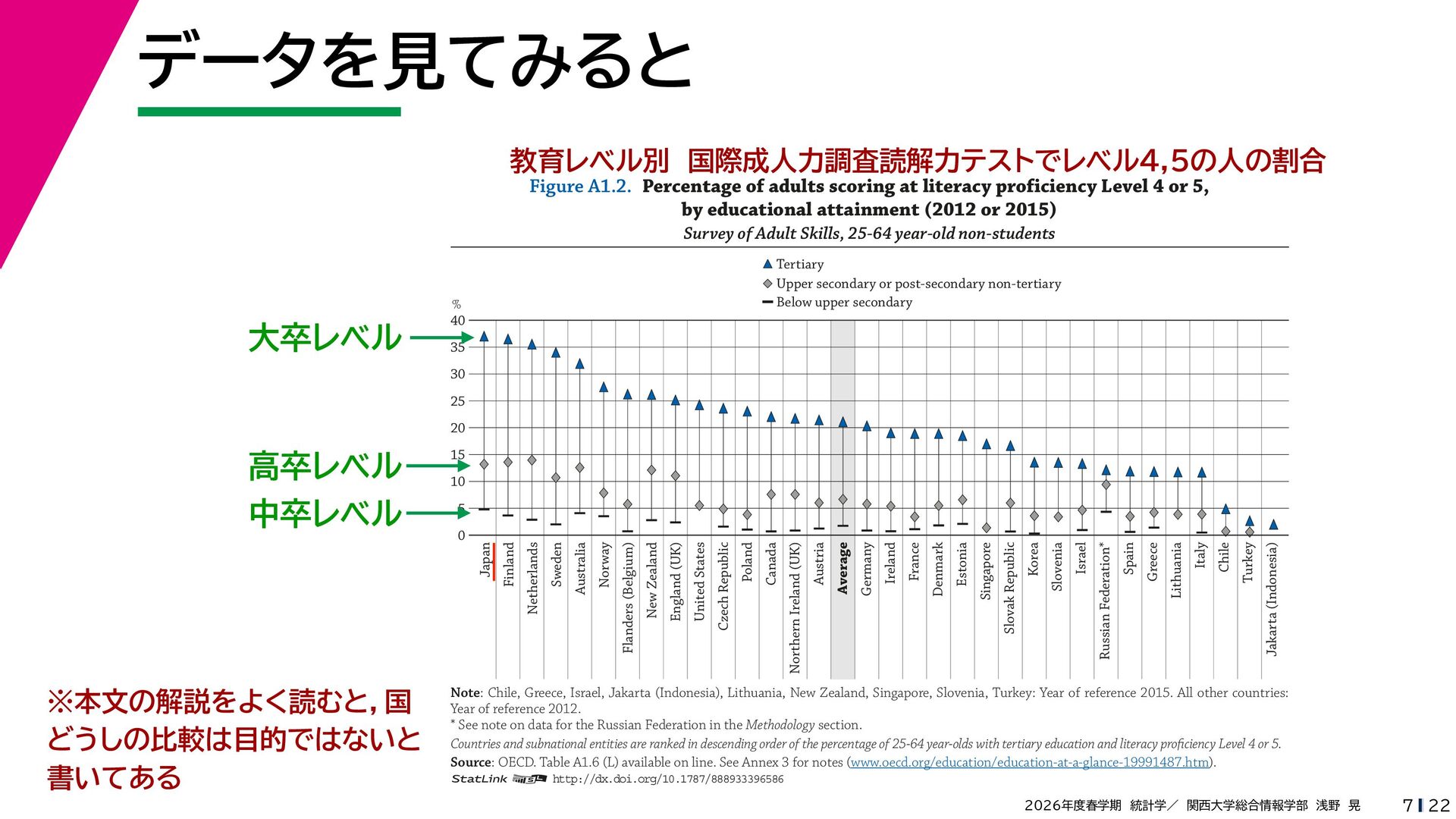 at literacy proficiency Level 4 or 5, by educational attainment (2012 or 2015) Survey of Adult Skills, 25-64 year-old non-students Note: Chile, Greece, Israel, Jakarta (Indonesia), Lithuania, New Zealand, Singapore, Slovenia, Turkey: Year of reference 2015. All other countries: Year of reference 2012. * See note on data for the Russian Federation in the Methodology section. Countries and subnational entities are ranked in descending order of the percentage of 25-64 year-olds with tertiary education and literacy proficiency Level 4 or 5. Source: OECD. Table A1.6 (L) available on line. See Annex 3 for notes (www.oecd.org/education/education-at-a-glance-19991487.htm). 1 2 http://dx.doi.org/10.1787/888933396586 Below upper secondary Upper secondary or post-secondary non-tertiary Tertiary Japan Finland Netherlands Sweden Australia Norway Flanders (Belgium) New Zealand England (UK) United States Czech Republic Poland Canada Northern Ireland (UK) Austria Average Germany Ireland France Denmark Estonia Singapore Slovak Republic Korea Slovenia Israel Russian Federation* Spain Greece Lithuania Italy Chile Turkey Jakarta (Indonesia) 40 35 30 25 20 15 10 5 0 % 教育レベル別 国際成人力調査読解力テストでレベル4,5の人の割合 大卒レベル 高卒レベル 中卒レベル ※本文の解説をよく読むと,国 どうしの比較は目的ではないと 書いてある
