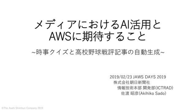 朝日新聞社・ICTRAD(研究開発チーム)では、AI(機械学習)を活用した様々な取り組みをしています。今回、2018年に公開したクイズの自動生成と高校野球戦評記事の自動生成を題材に、その研究開発手法やAWSの使い方を紹介するとともに、今後AWSに期待したいことについて共有します。