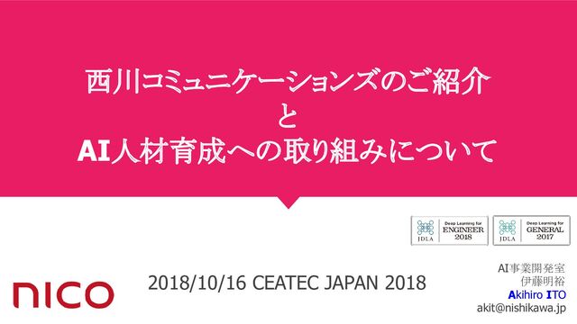 西川コミュニケーションズのご紹介 と AI人材育成への取り組みについて 2018/10/16 CEATEC JAPAN 2018 AI事業開発室 伊藤明裕 Akihiro