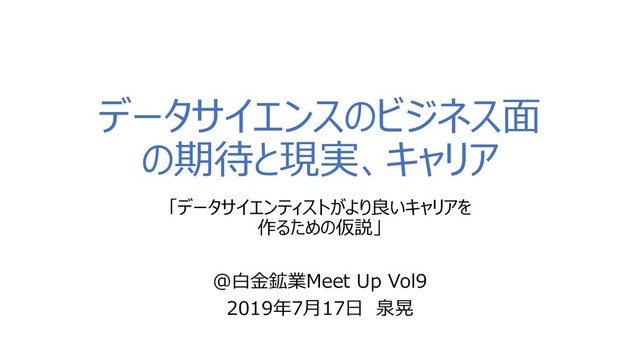 「データサイエンティストがより良いキャリアを作るための仮説」 2019年7月17日に白金鉱業Meet Up Vol9で、データサイエンティスト業界の今後や、価値の高いキャリアを形作っていく方向性について、自説をお話させて頂いた内容です。