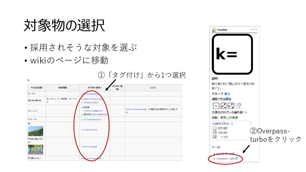 対象物の選択 • 採用されそうな対象を選ぶ • wikiのページに移動 ①「タグ付け」から1つ選択 ②Overpass- turboをクリック