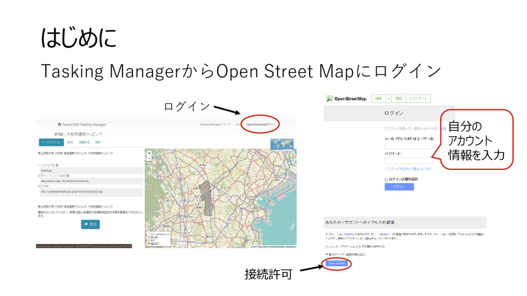 Tasking ManagerからOpen Street Mapにログイン はじめに 自分の アカウント 情報を入力 接続許可 ログイン