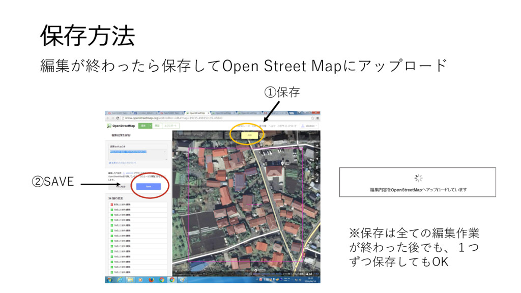 保存方法 編集が終わったら保存してOpen Street Mapにアップロード ①保存 ②SAVE ※保存は全ての編集作業 が終わった後でも、1つ ずつ保存してもOK