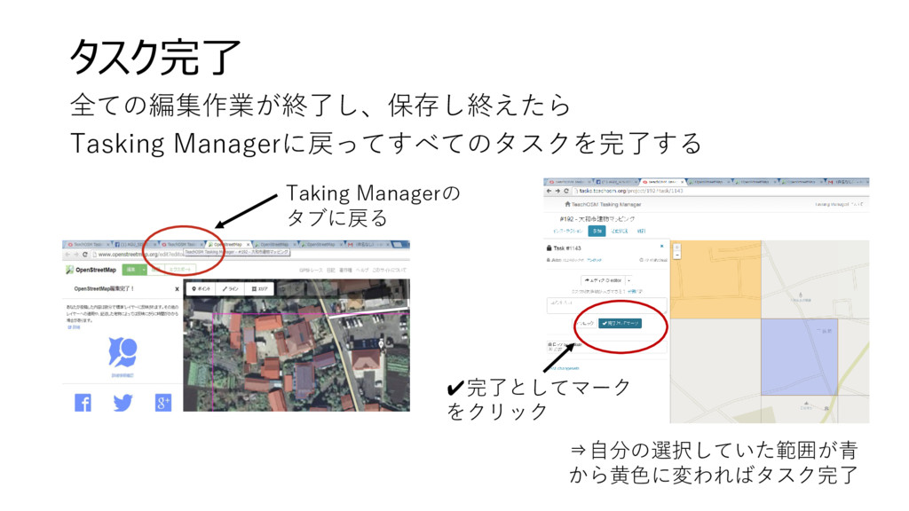 タスク完了 全ての編集作業が終了し、保存し終えたら Tasking Managerに戻ってすべてのタスクを完了する Taking Managerの タブに戻る ✔完了としてマーク をクリック ⇒自分の選択していた範囲が青