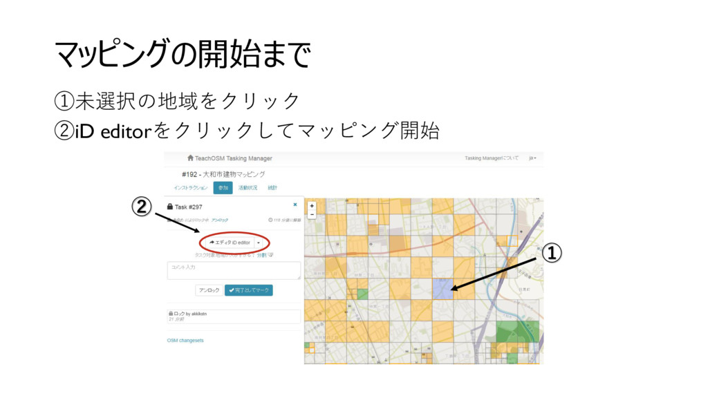マッピングの開始まで ①未選択の地域をクリック ②iD editorをクリックしてマッピング開始 ① ②