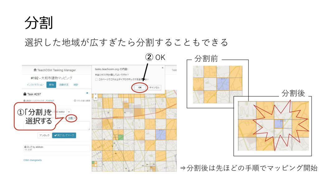 分割 選択した地域が広すぎたら分割することもできる ①「分割」を 選択する ② 分割前 分割後 ⇒分割後は先ほどの手順でマッピング開始 OK