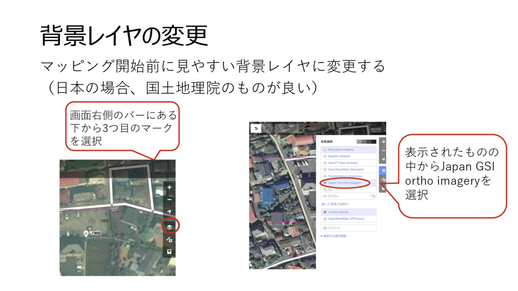 背景レイヤの変更 マッピング開始前に見やすい背景レイヤに変更する (日本の場合、国土地理院のものが良い) 画面右側のバーにある 下から3つ目のマーク を選択 表示されたものの 中からJapan GSI ortho