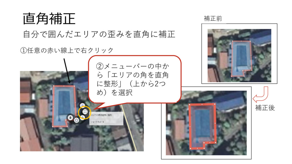 直角補正 自分で囲んだエリアの歪みを直角に補正 ①任意の赤い線上で右クリック ②メニューバーの中か ら「エリアの角を直角 に整形」(上から2つ め)を選択 補正前 補正後