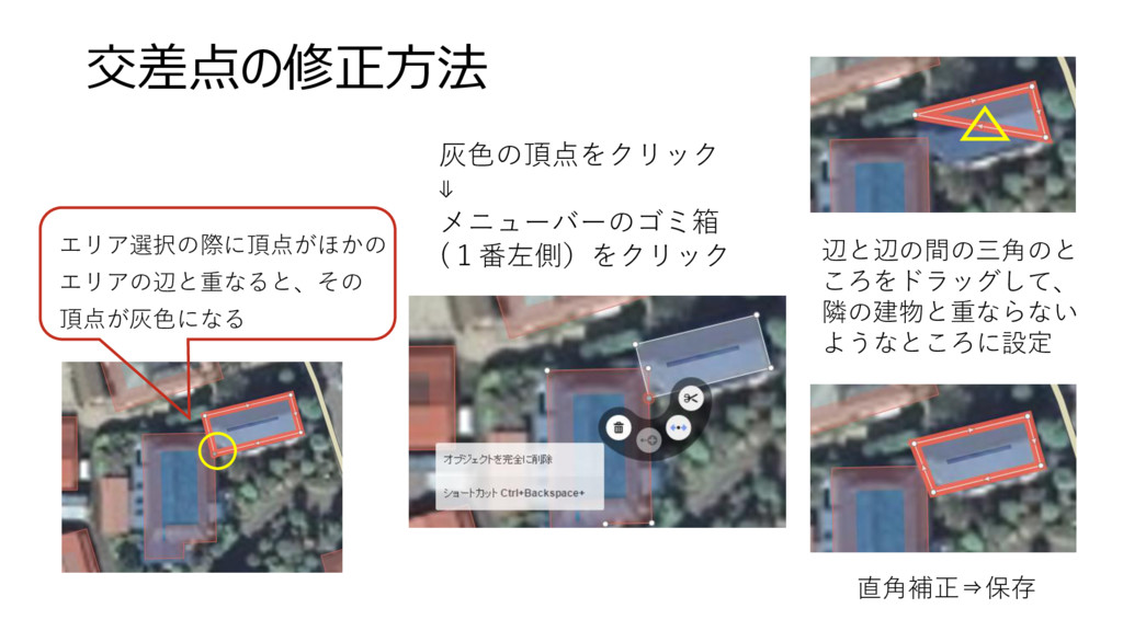 隣の建物と重ならない ようなところに設定 直角補正⇒保存