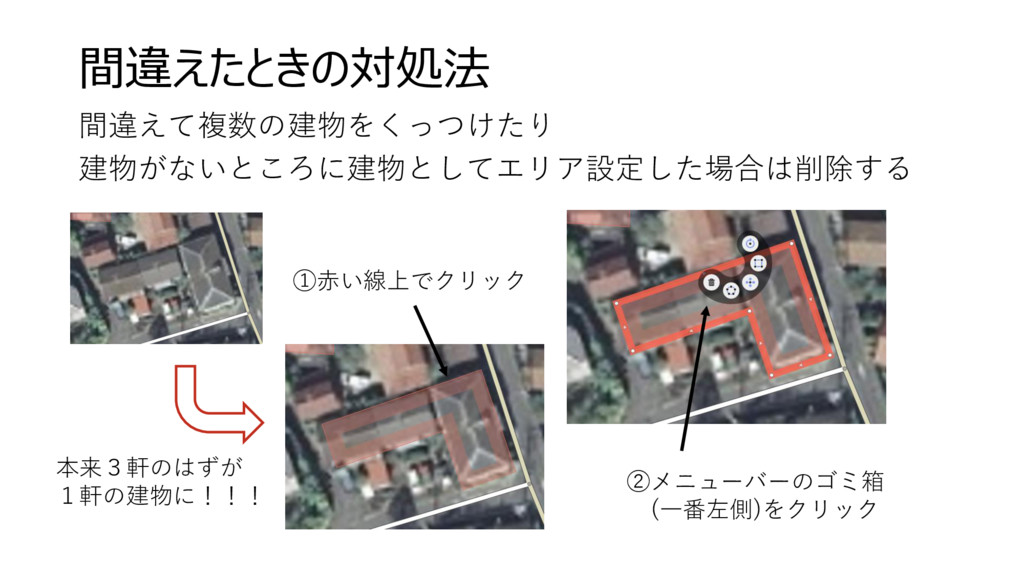 間違えたときの対処法 間違えて複数の建物をくっつけたり 建物がないところに建物としてエリア設定した場合は削除する 本来3軒のはずが 1軒の建物に!!! ①赤い線上でクリック ②メニューバーのゴミ箱 (一番左側)をクリック