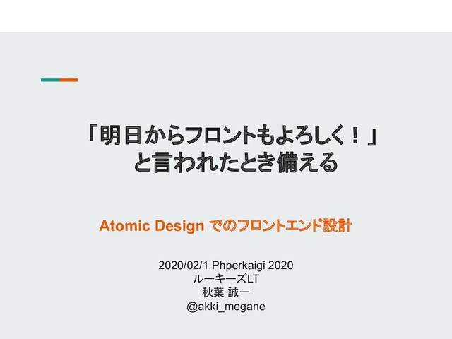 2020/02/1 Phperkaigi 2020 ルーキーズLT 秋葉 誠一 @akki_megane 「明日からフロントもよろしく!」 と言われたとき備える Atomic