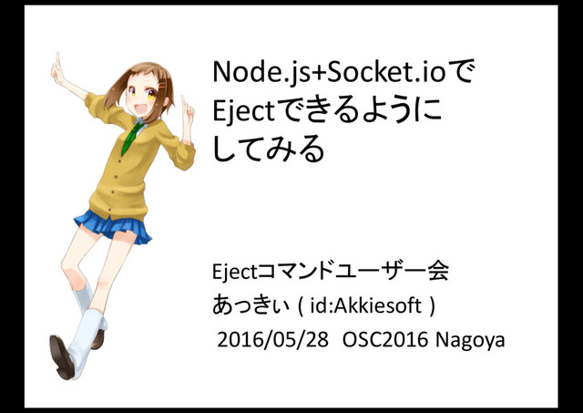 Node.js+Socket.ioで Ejectできるように してみる Ejectコマンドユーザー会 あっきぃ ( id:Akkiesoft ) 2016/05/28 OSC2016