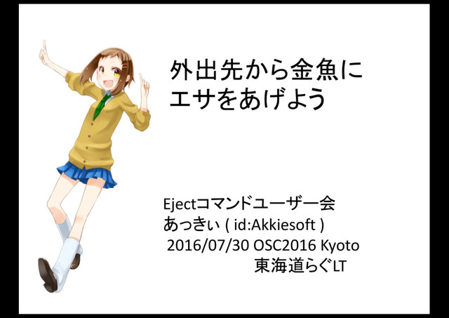 外出先から金魚に エサをあげよう Ejectコマンドユーザー会 あっきぃ ( id:Akkiesoft ) 2016/07/30 OSC2016 Kyoto