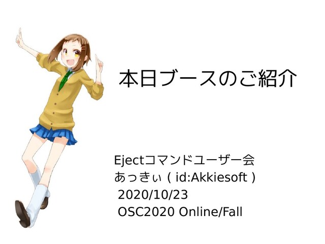 OSC2020 Tokyo/Fall Onlineの Ejectコマンドユーザー会 / あっきぃ(個人)ブースの説明スライドです。 当日はJitsiで配信されるので、いくつかの展示物は手元で操作して動きを見ることができます。