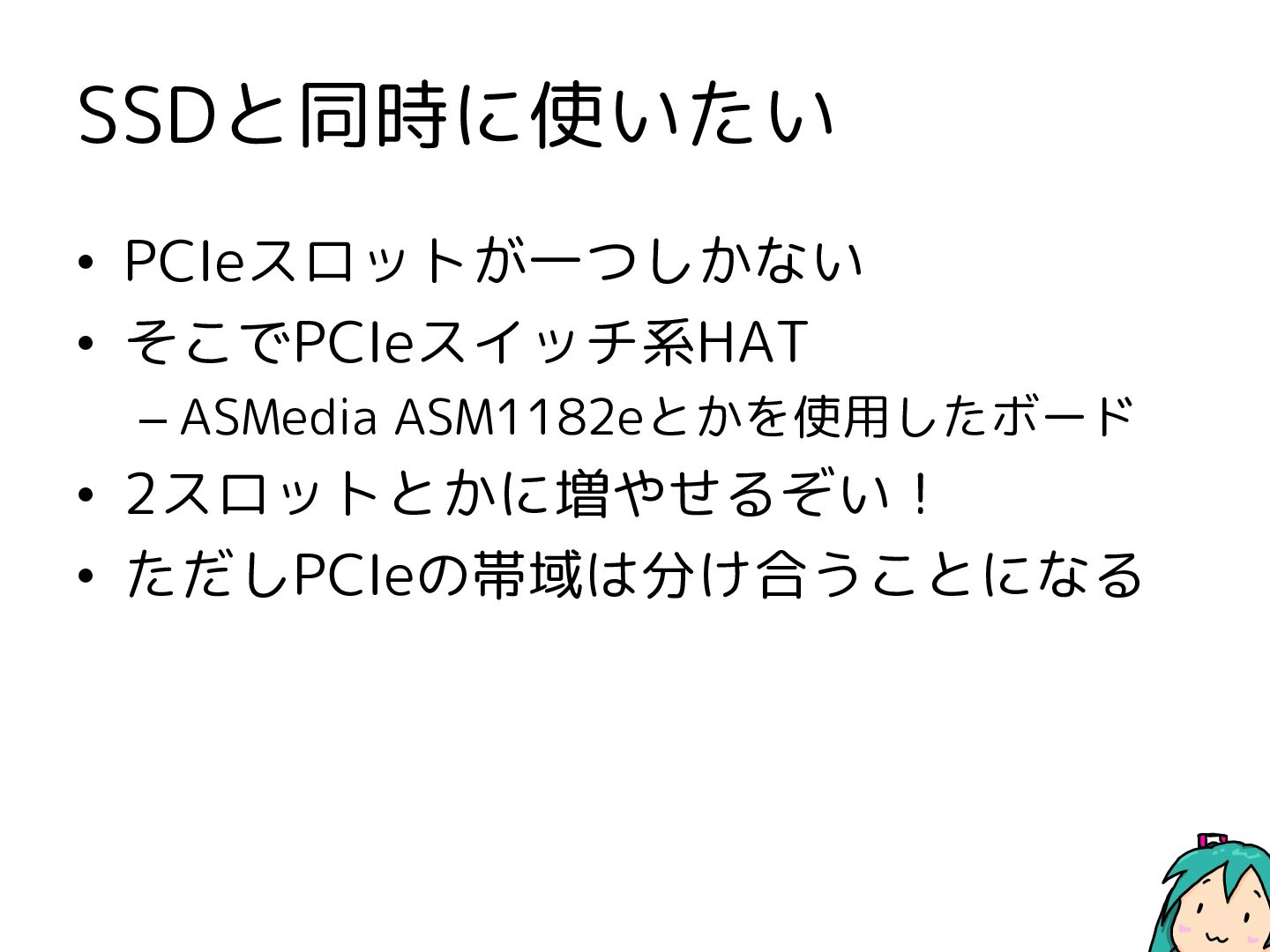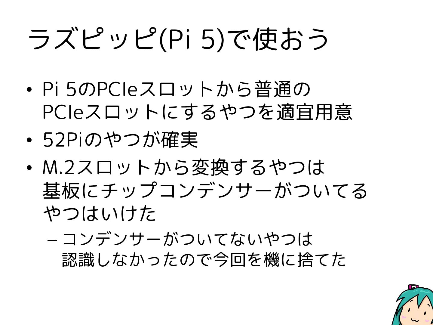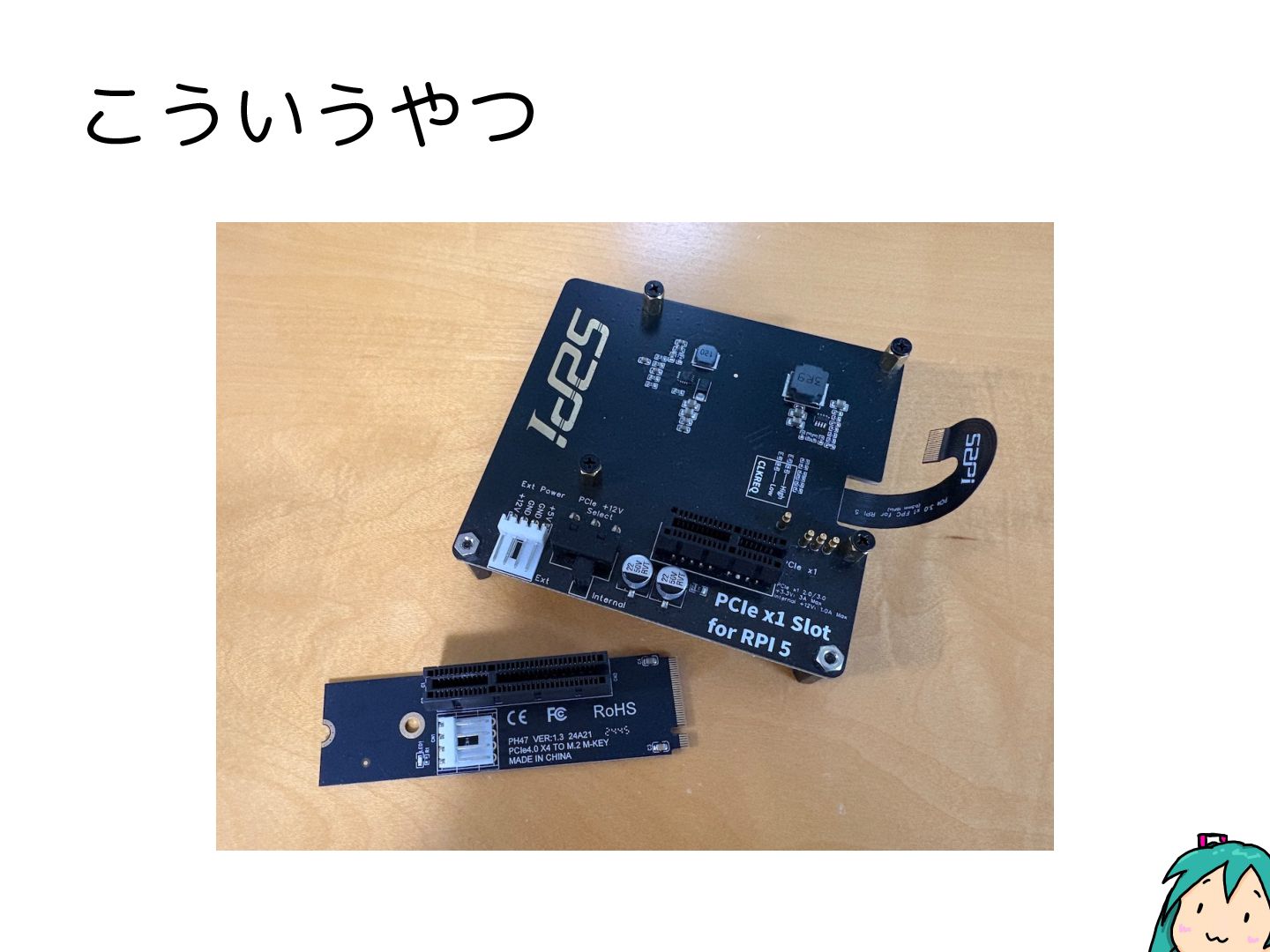 5. ラズピッピ(Pi 5)で使おう • Pi 5のPCIeスロットから普通の PCIeスロットにするやつを適宜用意 • 52Piのやつが確実 • M.2スロットから変換するやつは