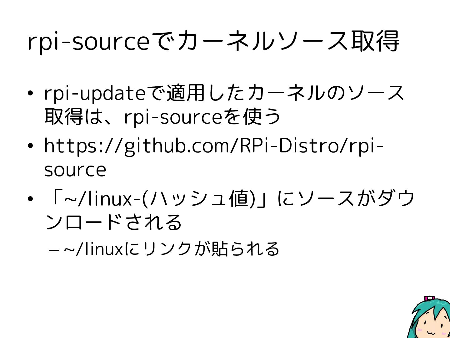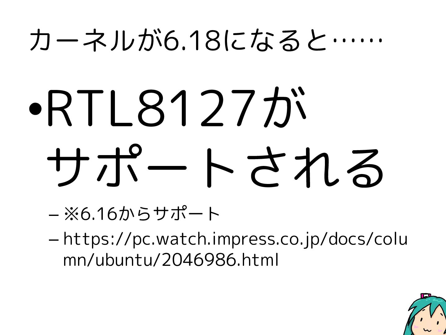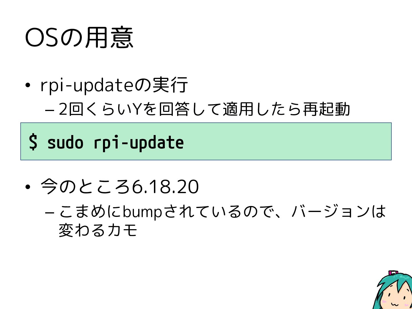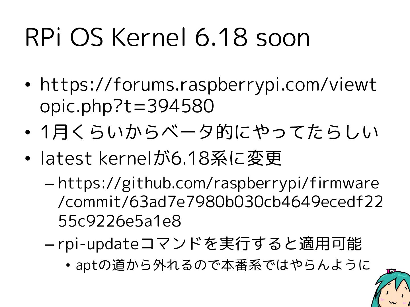 • latest kernelが6.18系に変更 – https://github.com/raspberrypi/firmware /commit/63ad7e7980b030cb4649ecedf22 55c9226e5a1e8 – rpi-updateコマンドを実行すると適用可能 • aptの道から外れるので本番系ではやらんように
