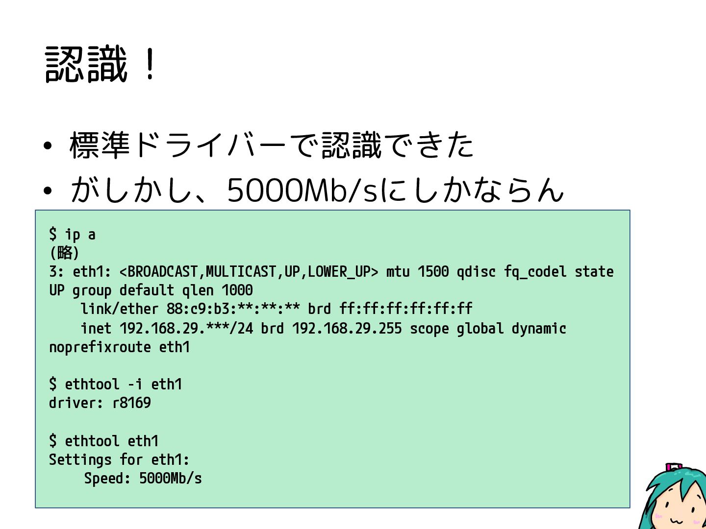 qdisc fq_codel state UP group default qlen 1000 link/ether 88:c9:b3:**:**:** brd ff:ff:ff:ff:ff:ff inet 192.168.29.***/24 brd 192.168.29.255 scope global dynamic noprefixroute eth1 $ ethtool -i eth1 driver: r8169 $ ethtool eth1 Settings for eth1: Speed: 5000Mb/s • 標準ドライバーで認識できた • がしかし、5000Mb/sにしかならん