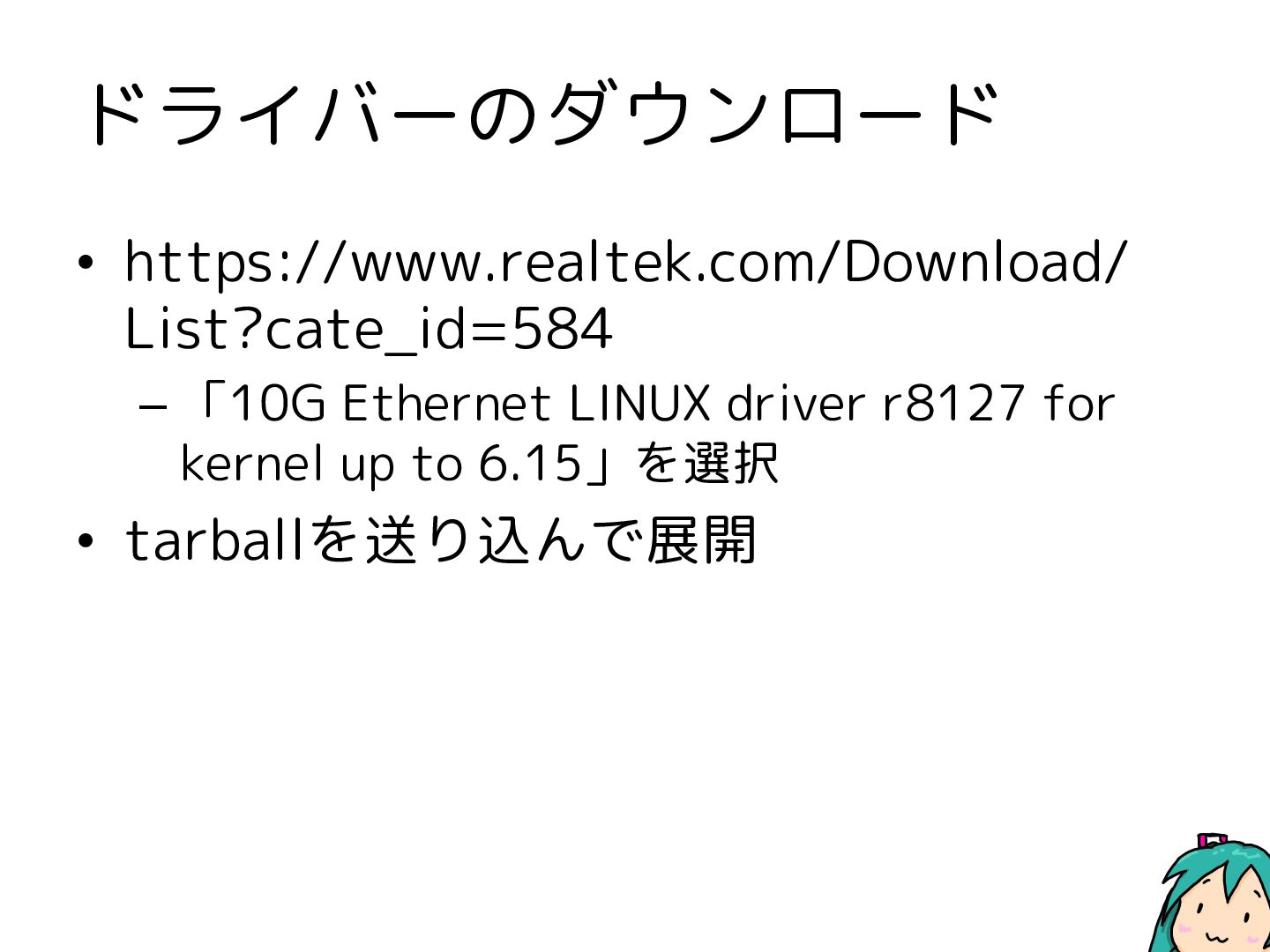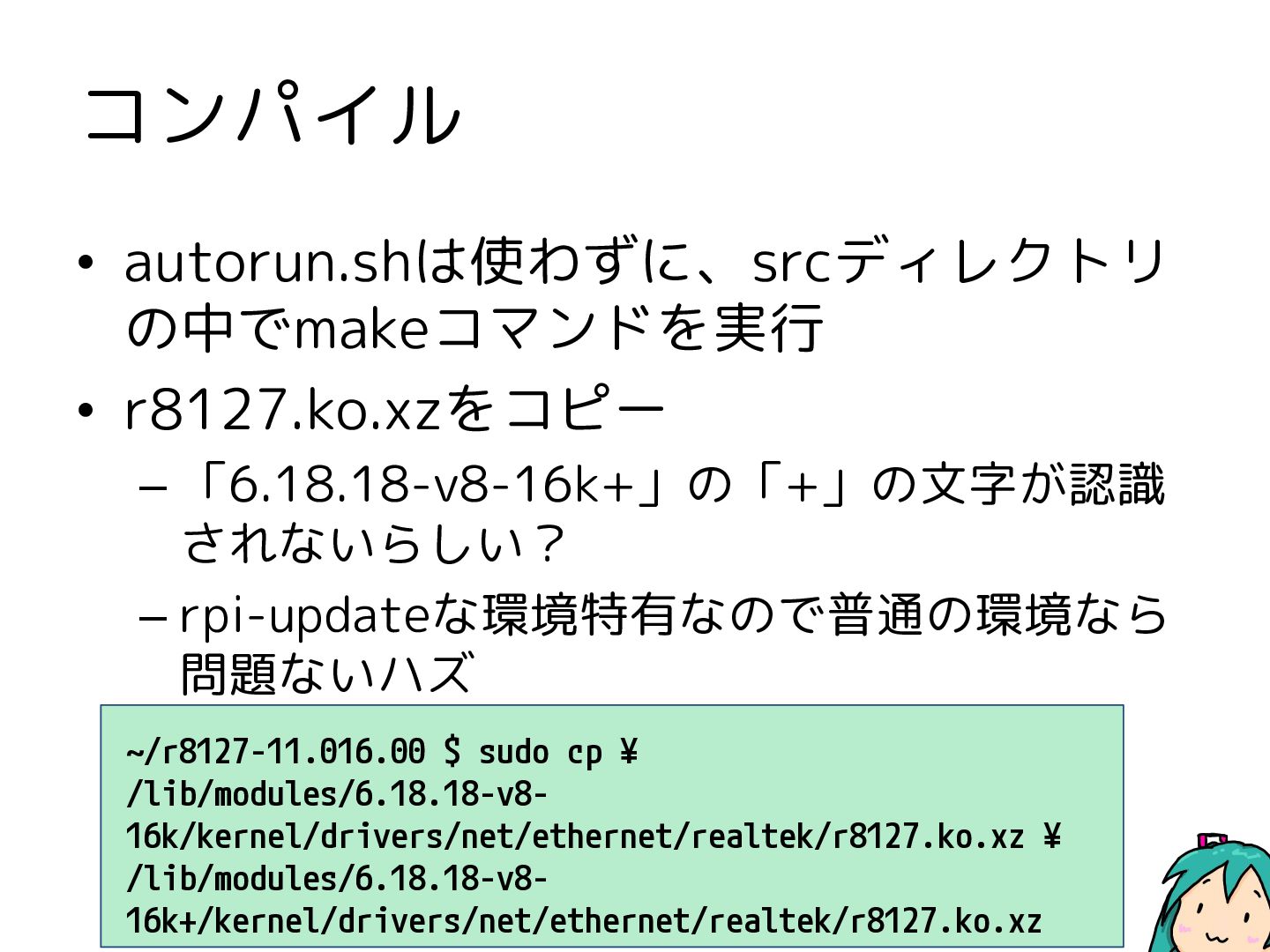 7. コンパイル • autorun.shは使わずに、srcディレクトリ の中でmakeコマンドを実行 • r8127.ko.xzをコピー – 「6.18.18-v8-16k+」の「+」の文字が認識 されないらしい? –