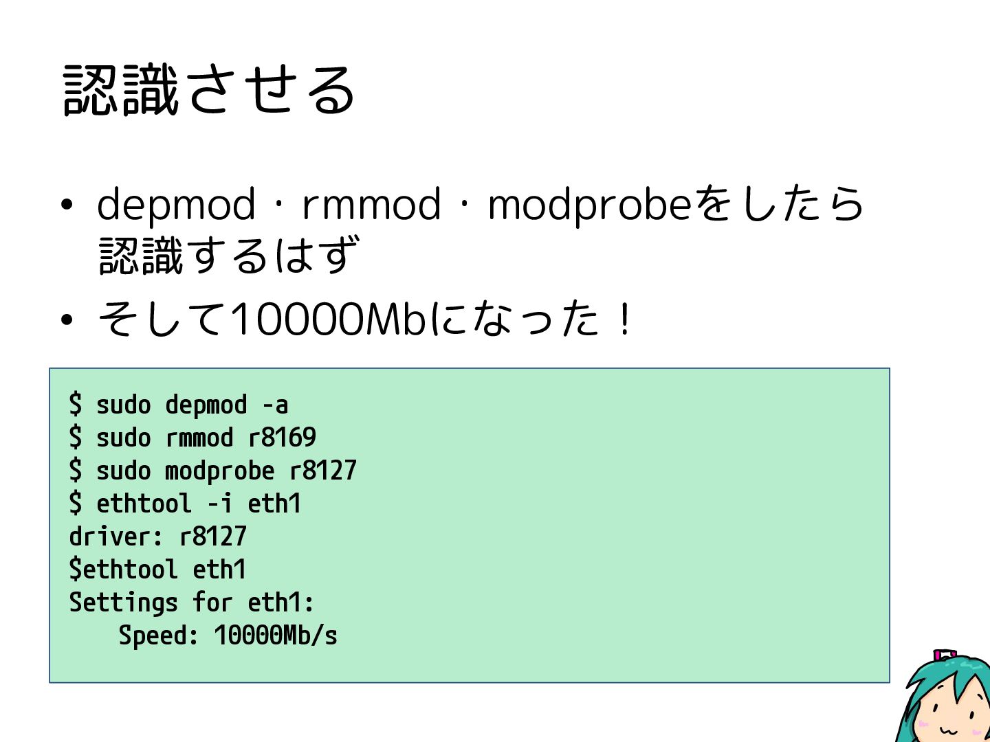 8. 認識させる • depmod・rmmod・modprobeをしたら 認識するはず • そして10000Mbになった! $ sudo depmod -a