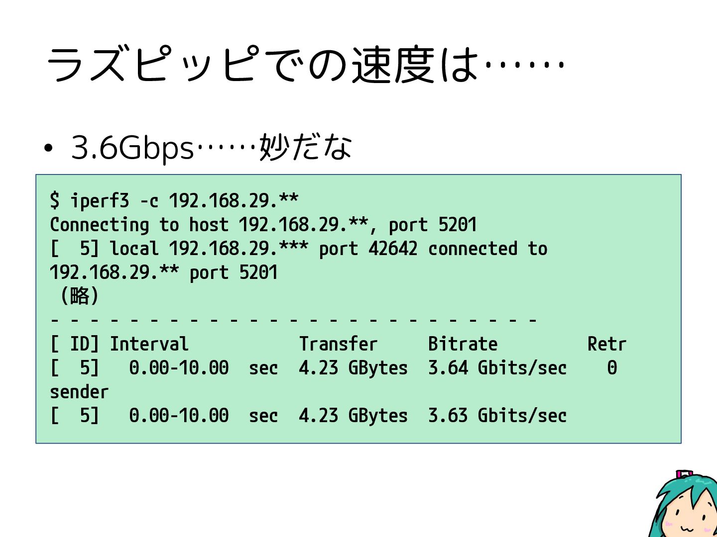 192.168.29.**, port 5201 [ 5] local 192.168.29.*** port 42642 connected to 192.168.29.** port 5201 (略) - - - - - - - - - - - - - - - - - - - - - - - - - [ ID] Interval Transfer Bitrate Retr [ 5] 0.00-10.00 sec 4.23 GBytes 3.64 Gbits/sec 0 sender [ 5] 0.00-10.00 sec 4.23 GBytes 3.63 Gbits/sec