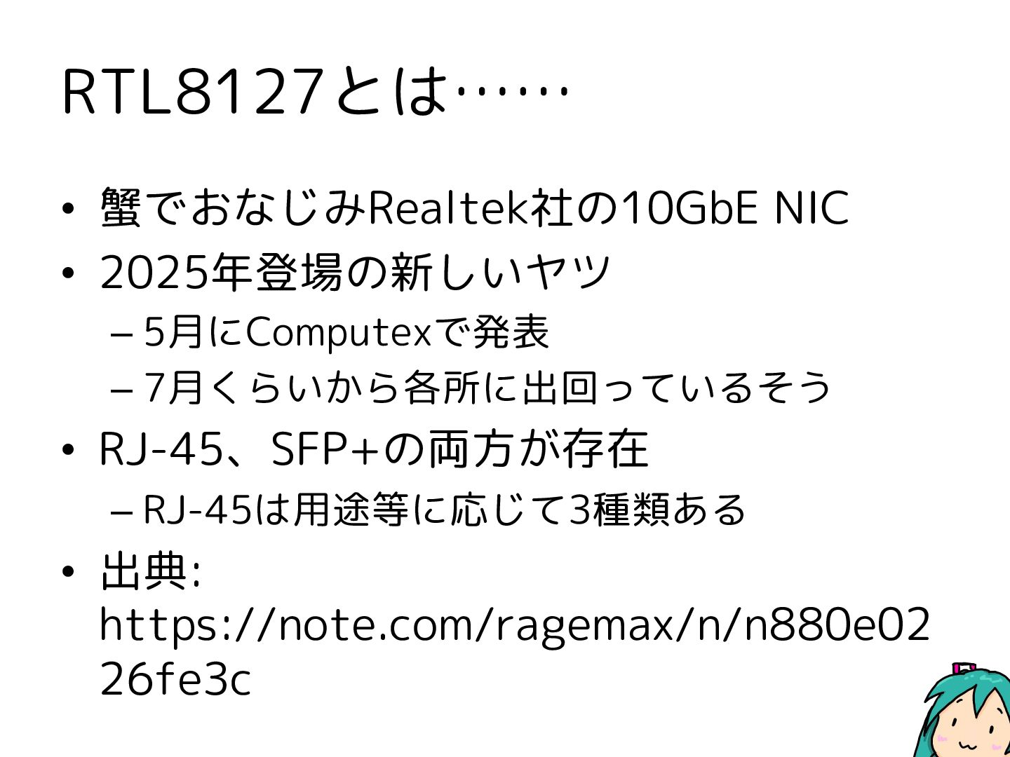 3. RTL8127とは…… • 蟹でおなじみRealtek社の10GbE NIC • 2025年登場の新しいヤツ – 5月にComputexで発表 – 7月くらいから各所に出回っているそう