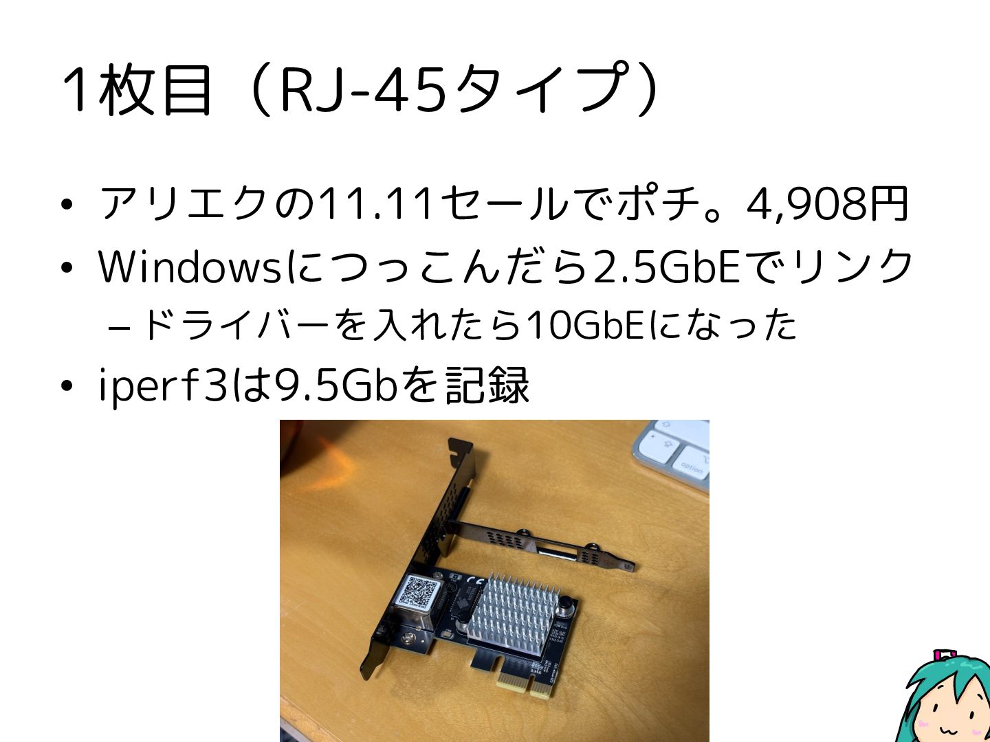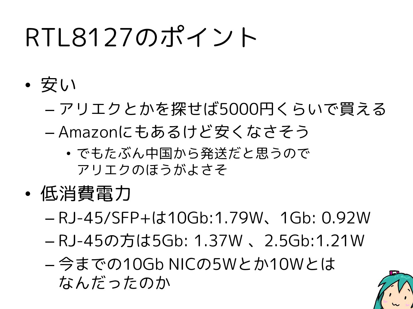 4. RTL8127のポイント • 安い – アリエクとかを探せば5000円くらいで買える – Amazonにもあるけど安くなさそう • でもたぶん中国から発送だと思うので アリエクのほうがよさそ