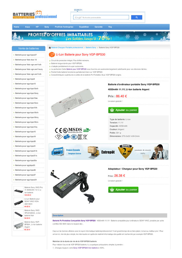 Batterie d'ordinateur portable Sony VGP-BPS30 4050mAh 11.1V, Li-Ion batterie Argent Livraison gratuite ! Type de batterie: Li-ion Tension: 11.1V Capacité: 4050mAh Couleur::Argent Poids: 331 g Dimensions: 270.2x22.1x54.3mm Adaptateur / Chargeur pour Sony VGP-BPS30 Livraison gratuite ! Batterie Chargeur Portable professionnel Batterie Sony Batterie Sony VGP-BPS30 Li-Lon Batterie pour Sony VGP-BPS30 Circuit de protection intégré. Pas d'effet mémoire. Batterie longue durée pour VGP-BPS30. s'adapte parfaitement et super autonomie. La perfection Cette Batterie pour VGP-BPS30 vous fournira une autonomie largement satisfisante pour vos diverses tâches. Parfait Cette batterie fonctionne parfaitement bien sur VGP-BPS30 Caractéristiques supérieures à celles de la batterie Pc Portables Asus VGP-BPS30 origine. Description Batterie Pc Portables Compatible Sony VGP-BPS30 - 4050mAh 11.1V - Batterie compatible pour ordinateurs SONY VAIO, produite par usine certifiée ISO 9001 dans le respect des . Cap sur les bonnes affaires avec le rayon informatique batterieprofessionnel ! Il est grand temps de se faire plaisir, le tout au meilleur prix ! Pour arriver ici, rien de plus simple, les internautes en quête de matériel informatique de qualité ont recherché par exemple VGP-BPS30. Maintien de la durée de vie de la VGP-BPS30 batterie Pour réduire l'usure de VGP-BPS30 batterie, il y a quelques précautions simples à prendre : 1 . Chargez toujours votre Sony VGP-BPS30 li-lon batterie à 100%. Batterie Sony VAIO Pro 11 4690mAh 7.5 V, Li- Ion batterie Li-Lon Batterie pour SONY VAIO VGN- AW11M/H Batterie Sony VAIO VPCZ129GG , Li-Ion batterie Noir Batterie Sony VGP- BPS8A , Li-Ion batterie Argent Vente de batteries Batterie pour vgp-bpsc27 Batterie pour Vaio duo 13 Batterie pour Vaio vgn aw11s/b Batterie pour Vaio vgn aw11xu/q Batterie pour Vaio vgn aw11z/b Batterie pour vgp-bps9 Batterie pour vgp-bps13 Batterie pour vgp-bps13a/b Batterie pour vgp-bps13a/q Batterie pour vgp-bps13as Batterie pour vgp-bps13a/s Batterie pour vgp-bps13/b Batterie pour vgp-bps13b/b Batterie pour vgp-bps13b/q Batterie pour vgp-bps13b/s Batterie pour vgp-bps13/q Batterie pour vgp-bps15 Batterie pour vgp-bps19 Batterie pour vgp-bps20 Batterie pour vgp-bps21 Batterie pour vgp-bps21/b Batterie pour vgp-bps21/s Batterie pour vgp-bps22a Batterie pour vgpbps23 Batterie pour vgp-bps26 Batterie pour vgp-bps27 Batterie pour vgp-bpsc24 103.06 € 44.65 € 54.63 € 65.35 € Prix : 86.40 € Price: 26.38 €