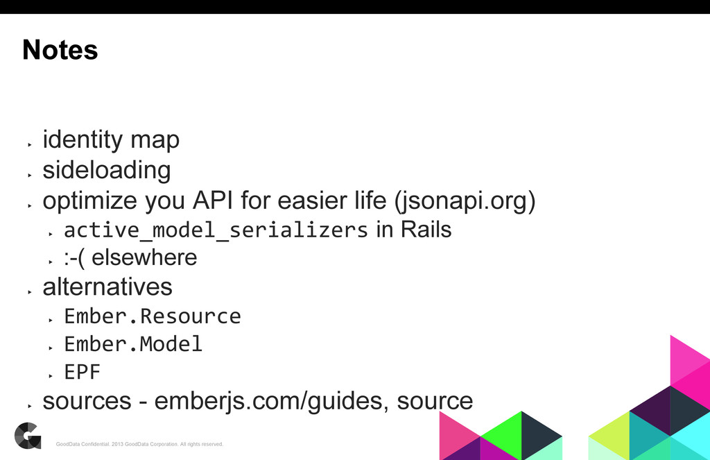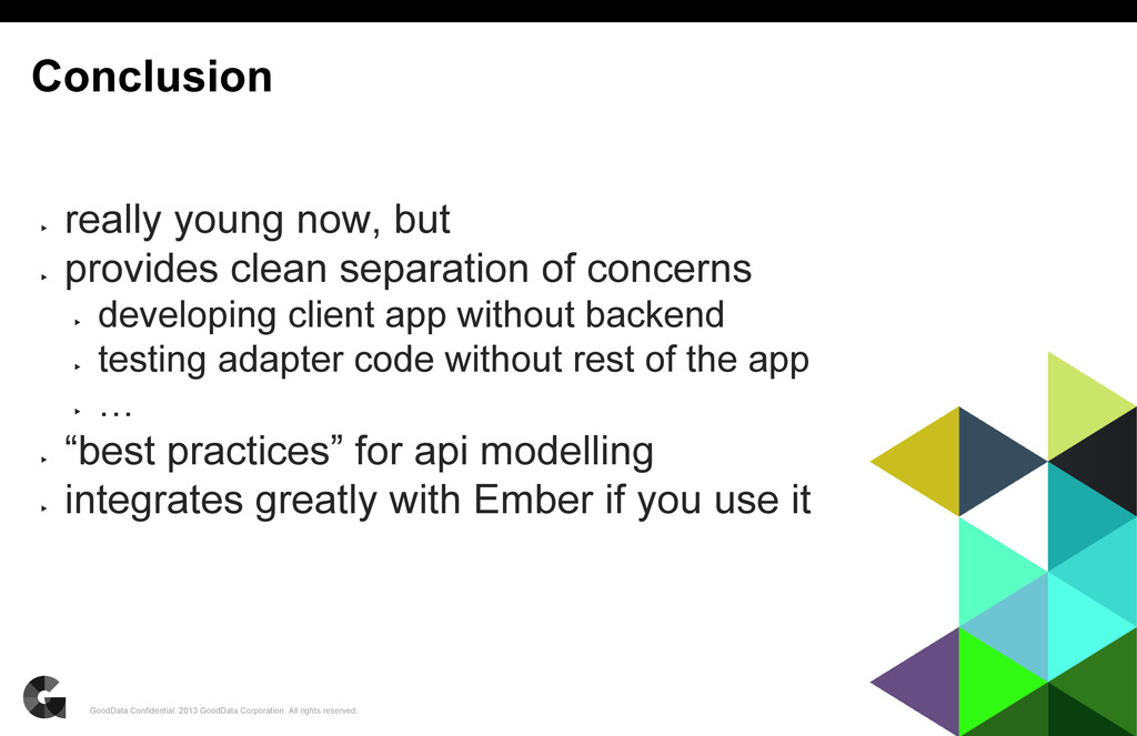 young now, but ▶ provides clean separation of concerns ▶ developing client app without backend ▶ testing adapter code without rest of the app ▶ … ▶ “best practices” for api modelling ▶ integrates greatly with Ember if you use it Conclusion