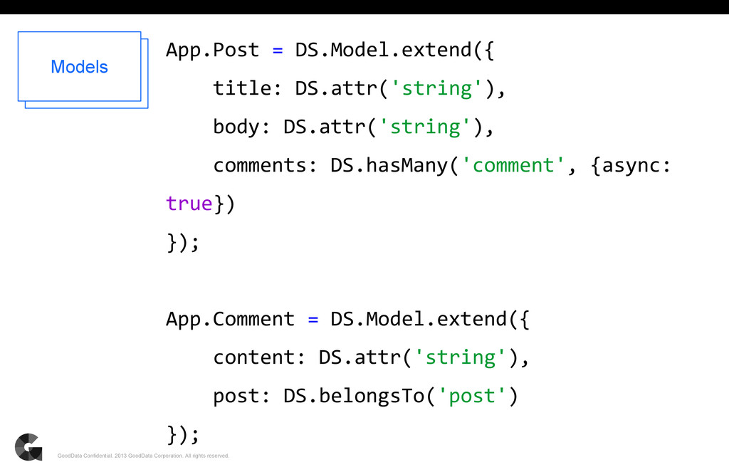 querying and saving ▶ store.find[All,Query](‘model-name’[, id]); ▶ model_object.save(); ▶ both finders and save return promises for developer sanity (formerly a state chart with actions on edges) ▶ Em.RSVP.all([promise1, promise2]).then ...