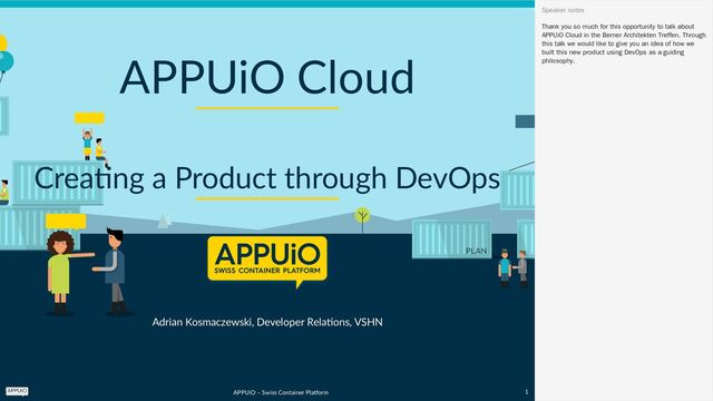 Since its foundation in 2014, the slogan of VSHN has been 'The DevOps Company'. Following that ethos, VSHN applied all of its practice of DevOps and Agile to the creation of its latest product, APPUiO Cloud. In this session we are going to see how DevOps shaped product and human management decisions throughout the process, from idea to market.