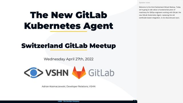 Kosmaczewski, Developer Relations, VSHN The New GitLab Kubernetes Agent Switzerland GitLab Meetup Welcome to the third Switzerland GitLab Meetup. Today we’re going to talk about a fundamental piece of machinery for GitOps engineers working with GitLab: the new GitLab Kubernetes Agent, replacing the old certificate-based integration, to be discontinued soon. Speaker notes 1