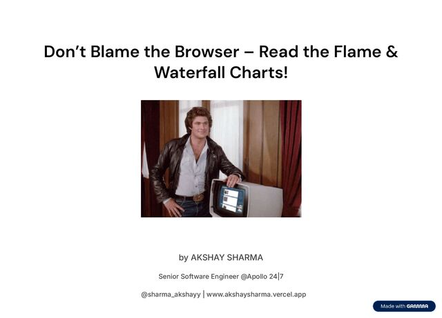 user expectations. When a page feels slow, we often jump to conclusions: <Is it the browser? The network? The JS? CPU ?î This talk is about moving beyond guesswork. We'll explore how to read and understand two powerful tools built right into your browser: Flame Charts 4 to uncover what¾s clogging the main thread Waterfall Charts 4 to trace how every asset loads, stalls, or blocks