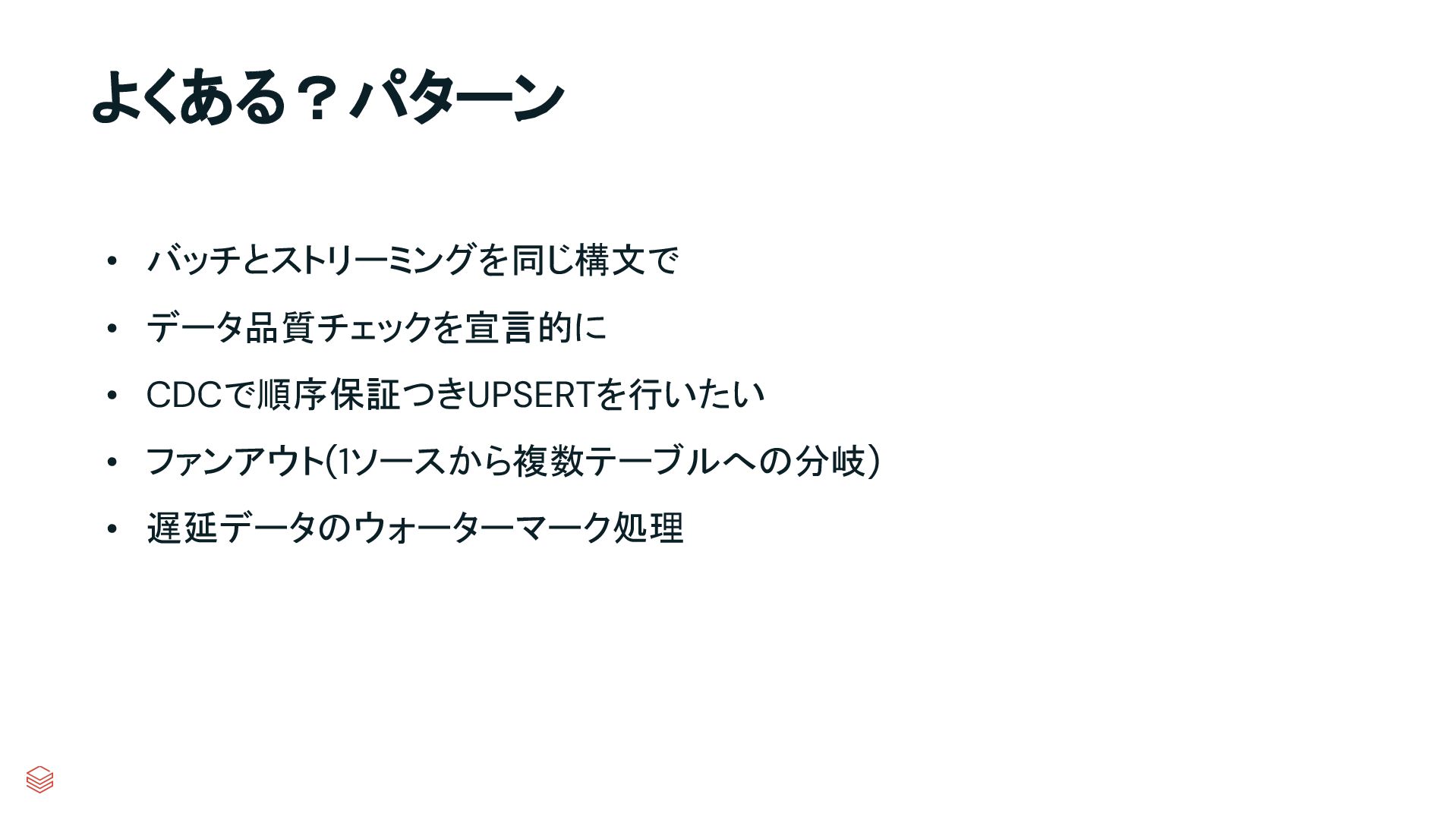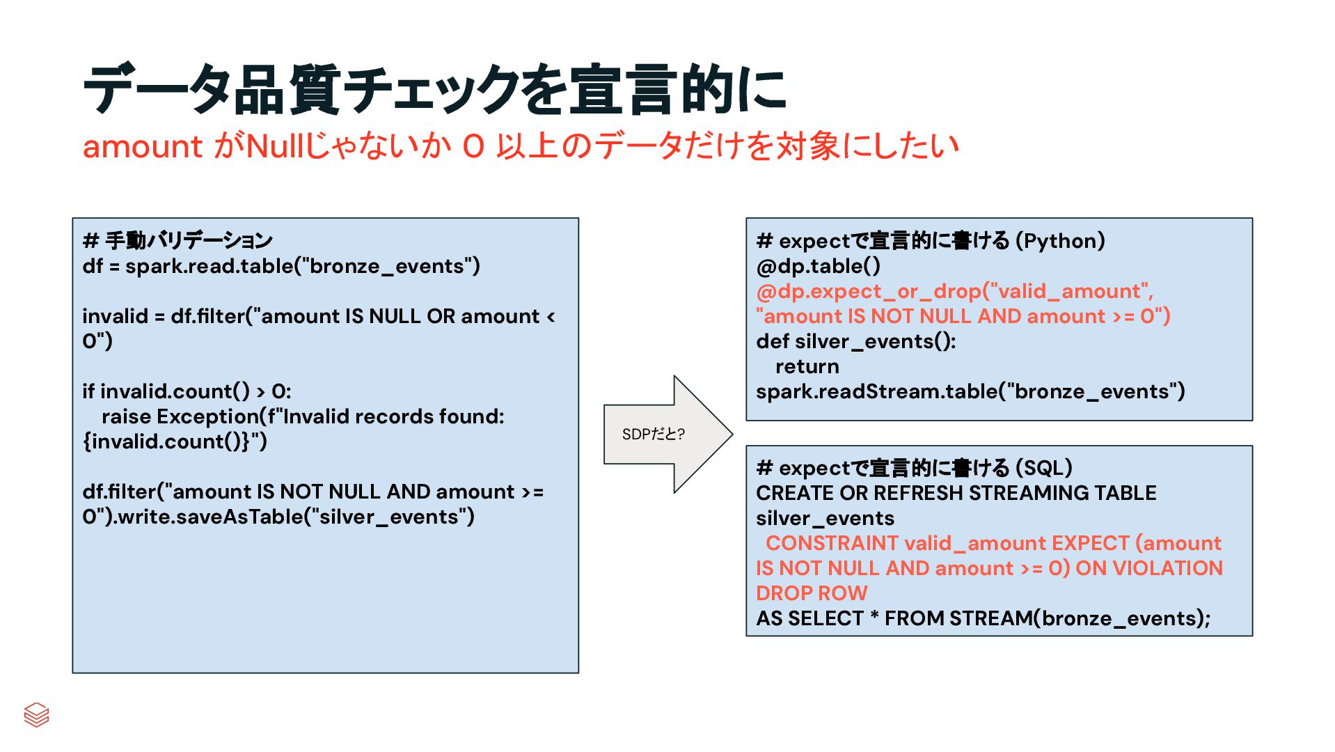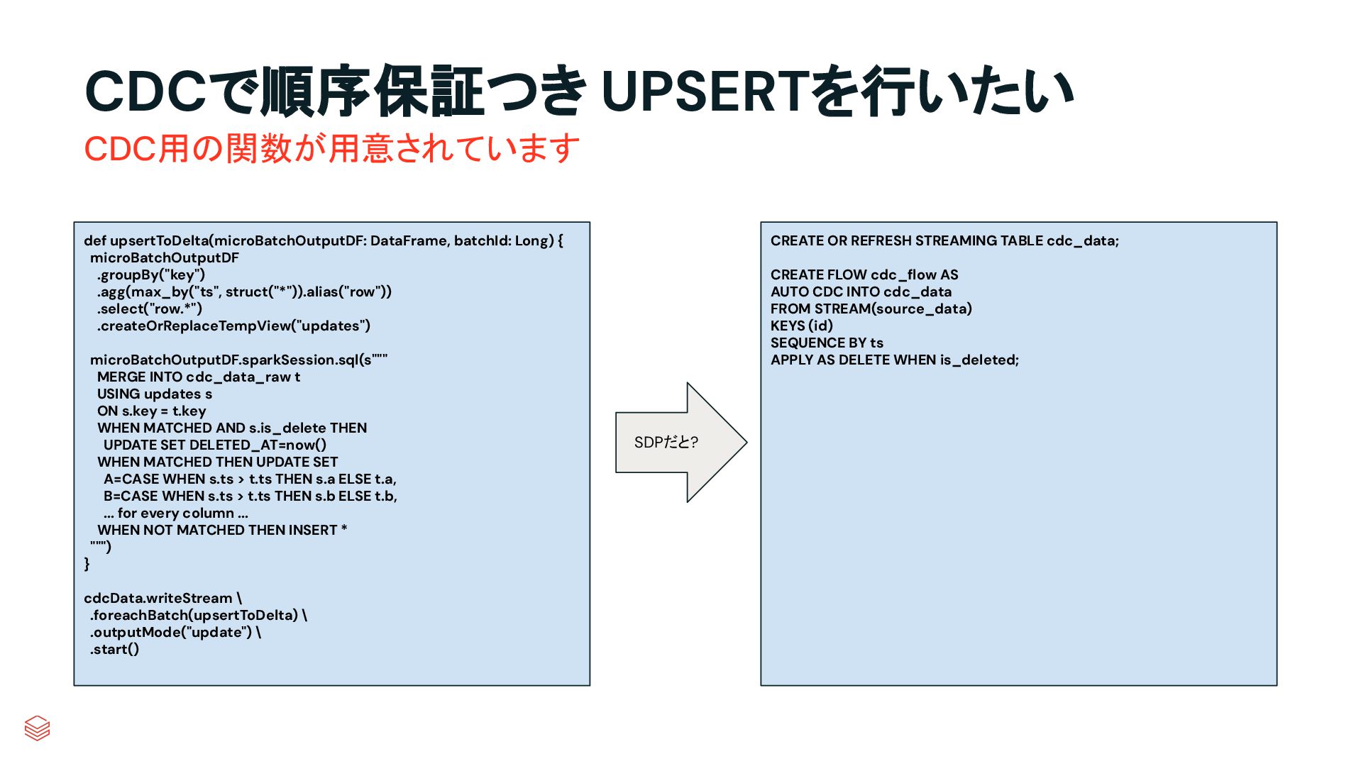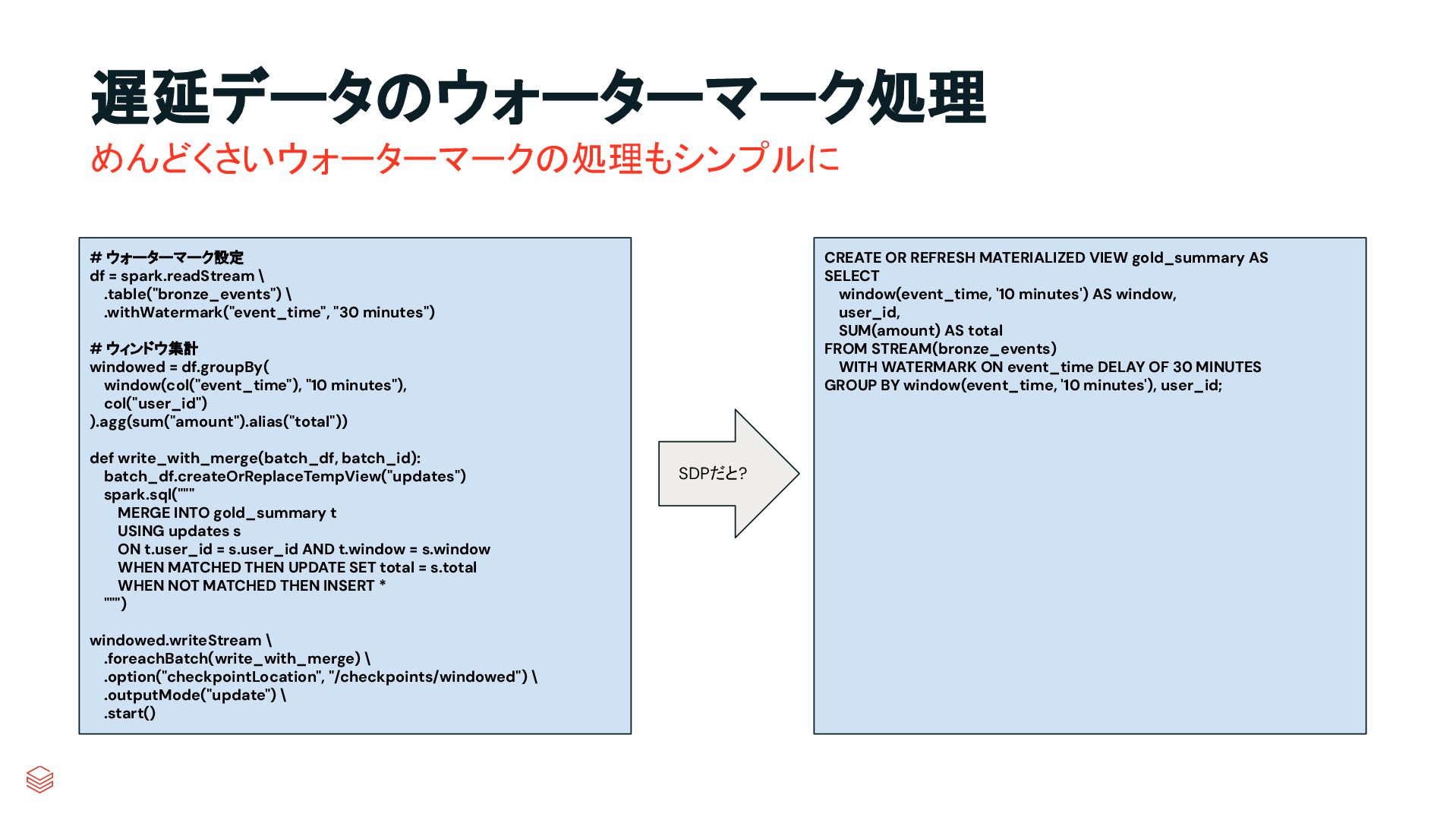 .table("bronze_events") \ .withWatermark("event_time", "30 minutes") # ウィンドウ集計 windowed = df.groupBy( window(col("event_time"), "10 minutes"), col("user_id") ).agg(sum("amount").alias("total")) def write_with_merge(batch_df, batch_id): batch_df.createOrReplaceTempView("updates") spark.sql(""" MERGE INTO gold_summary t USING updates s ON t.user_id = s.user_id AND t.window = s.window WHEN MATCHED THEN UPDATE SET total = s.total WHEN NOT MATCHED THEN INSERT * """) windowed.writeStream \ .foreachBatch(write_with_merge) \ .option("checkpointLocation", "/checkpoints/windowed") \ .outputMode("update") \ .start() CREATE OR REFRESH MATERIALIZED VIEW gold_summary AS SELECT window(event_time, '10 minutes') AS window, user_id, SUM(amount) AS total FROM STREAM(bronze_events) WITH WATERMARK ON event_time DELAY OF 30 MINUTES GROUP BY window(event_time, '10 minutes'), user_id; SDPだと?