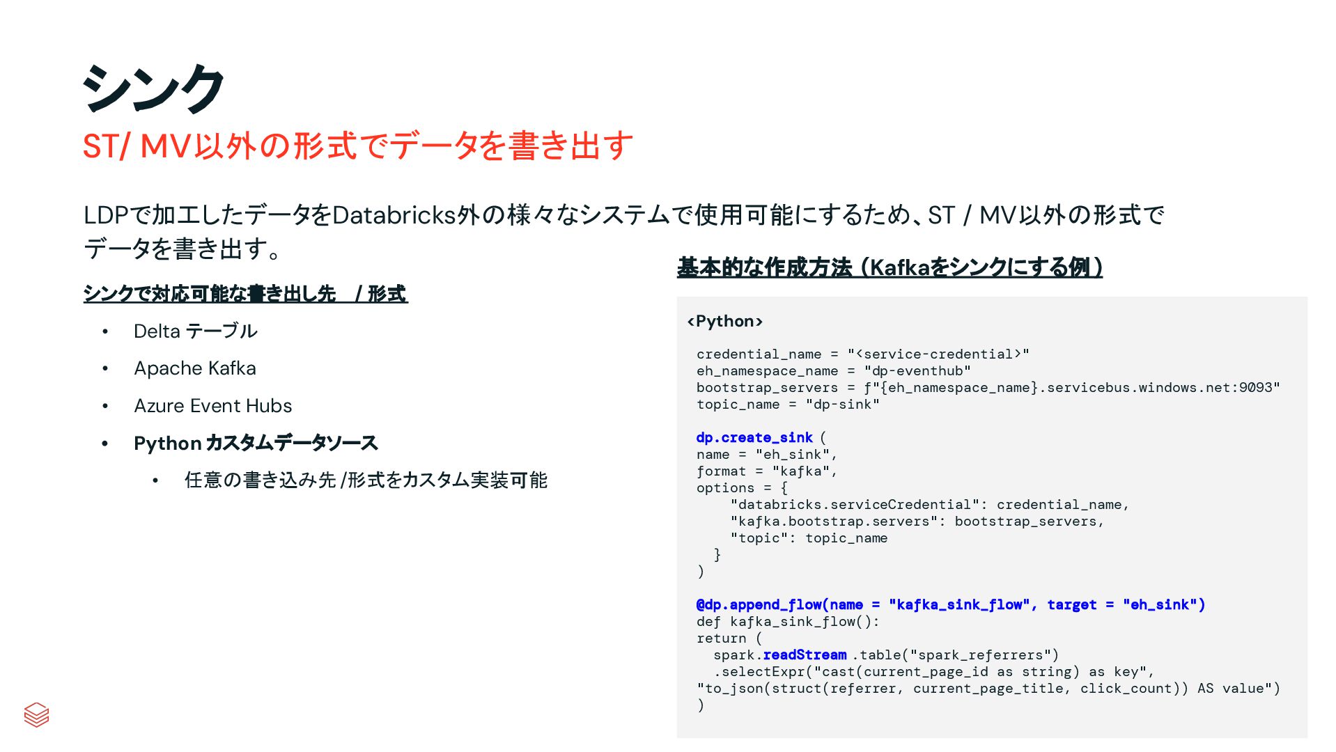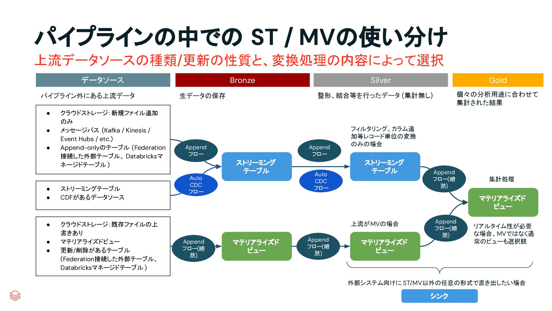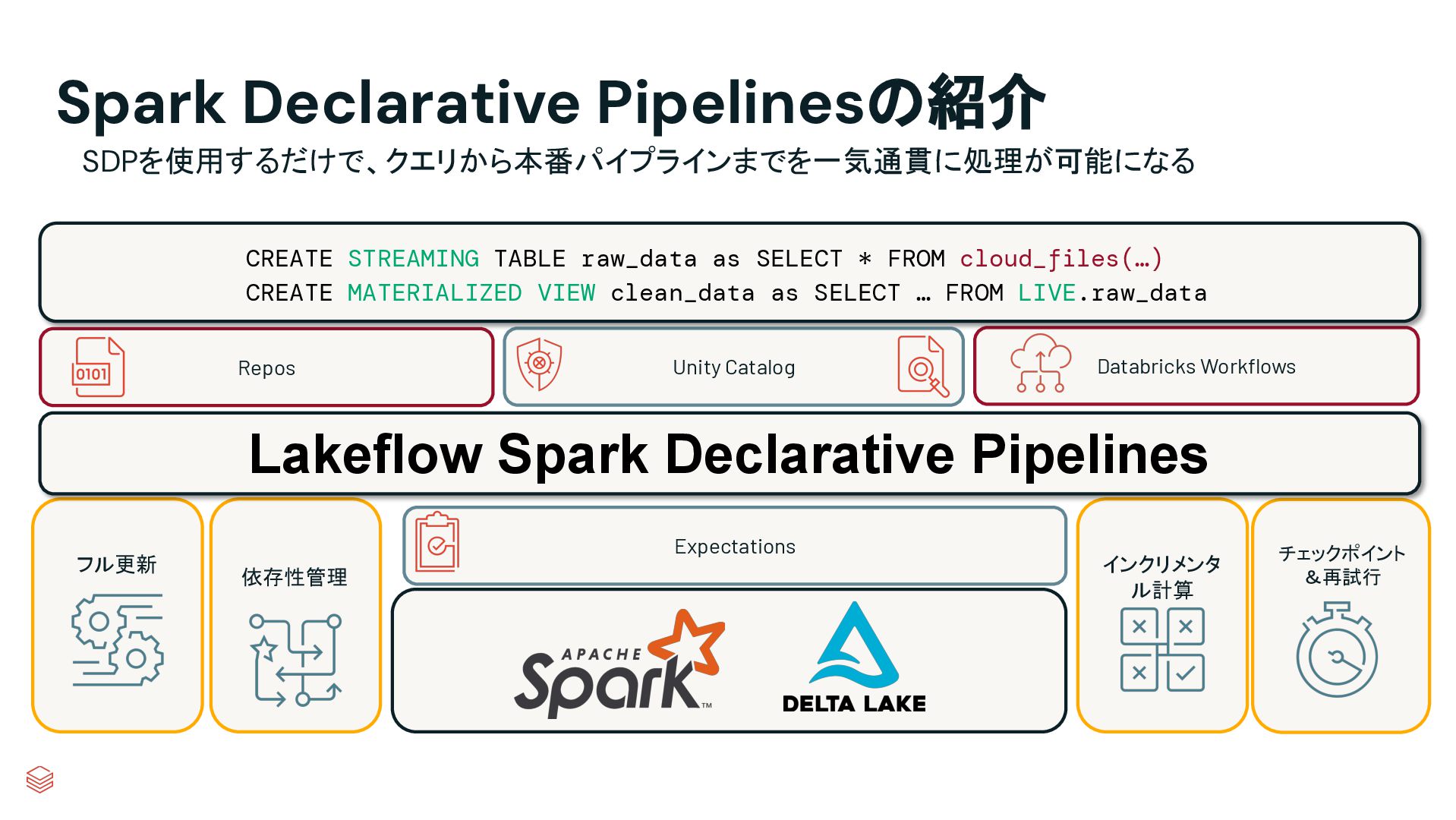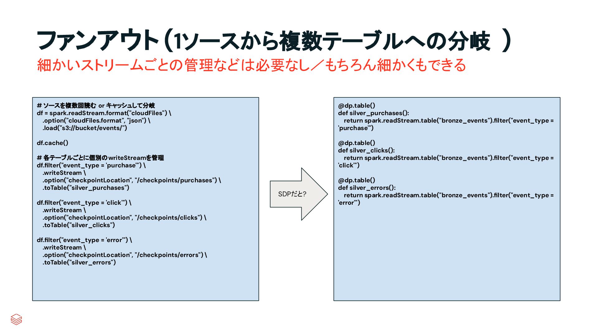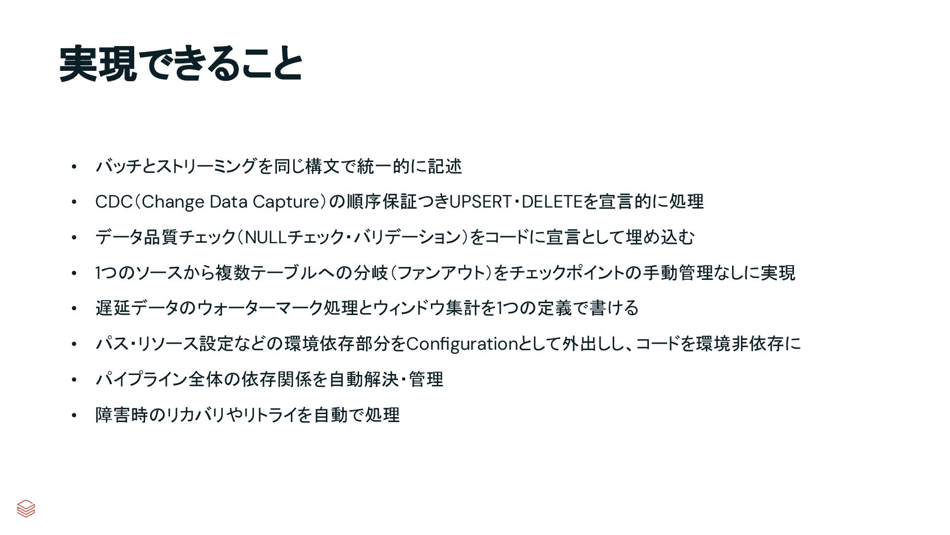 .table("bronze_events") \ .withWatermark("event_time", "30 minutes") # ウィンドウ集計 windowed = df.groupBy( window(col("event_time"), "10 minutes"), col("user_id") ).agg(sum("amount").alias("total")) def write_with_merge(batch_df, batch_id): batch_df.createOrReplaceTempView("updates") spark.sql(""" MERGE INTO gold_summary t USING updates s ON t.user_id = s.user_id AND t.window = s.window WHEN MATCHED THEN UPDATE SET total = s.total WHEN NOT MATCHED THEN INSERT * """) windowed.writeStream \ .foreachBatch(write_with_merge) \ .option("checkpointLocation", "/checkpoints/windowed") \ .outputMode("update") \ .start() CREATE OR REFRESH MATERIALIZED VIEW gold_summary AS SELECT window(event_time, '10 minutes') AS window, user_id, SUM(amount) AS total FROM STREAM(bronze_events) WITH WATERMARK ON event_time DELAY OF 30 MINUTES GROUP BY window(event_time, '10 minutes'), user_id; SDPだと?