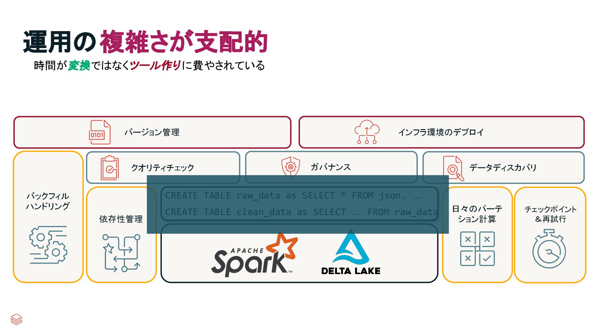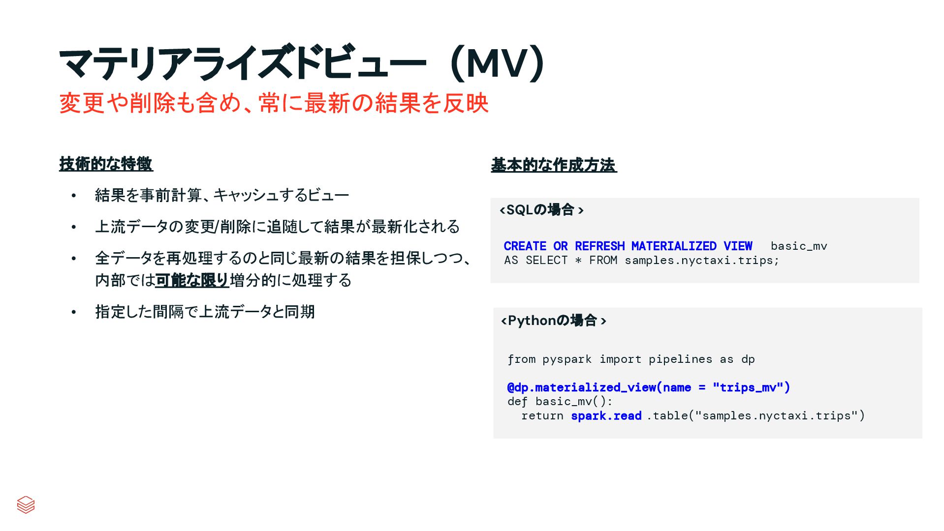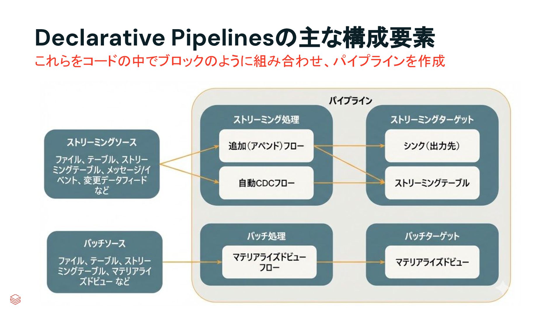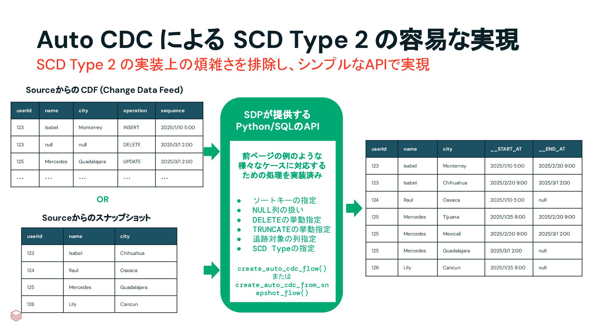 .table("bronze_events") \ .withWatermark("event_time", "30 minutes") # ウィンドウ集計 windowed = df.groupBy( window(col("event_time"), "10 minutes"), col("user_id") ).agg(sum("amount").alias("total")) def write_with_merge(batch_df, batch_id): batch_df.createOrReplaceTempView("updates") spark.sql(""" MERGE INTO gold_summary t USING updates s ON t.user_id = s.user_id AND t.window = s.window WHEN MATCHED THEN UPDATE SET total = s.total WHEN NOT MATCHED THEN INSERT * """) windowed.writeStream \ .foreachBatch(write_with_merge) \ .option("checkpointLocation", "/checkpoints/windowed") \ .outputMode("update") \ .start() CREATE OR REFRESH MATERIALIZED VIEW gold_summary AS SELECT window(event_time, '10 minutes') AS window, user_id, SUM(amount) AS total FROM STREAM(bronze_events) WITH WATERMARK ON event_time DELAY OF 30 MINUTES GROUP BY window(event_time, '10 minutes'), user_id; SDPだと?