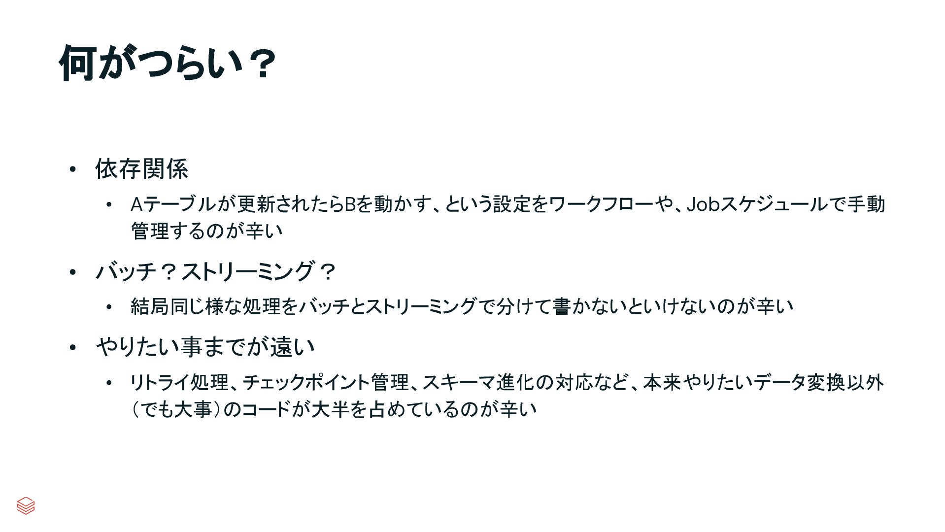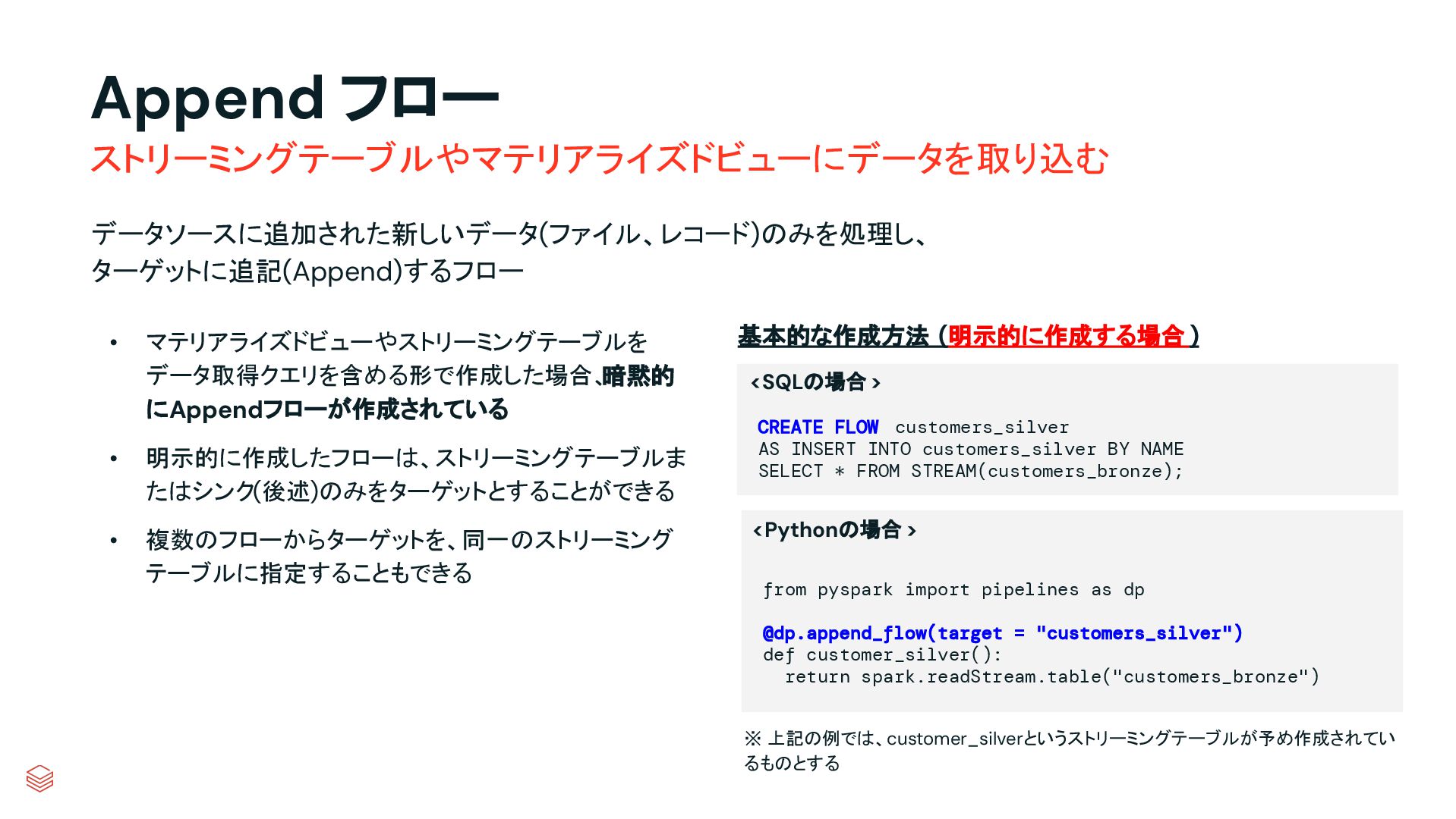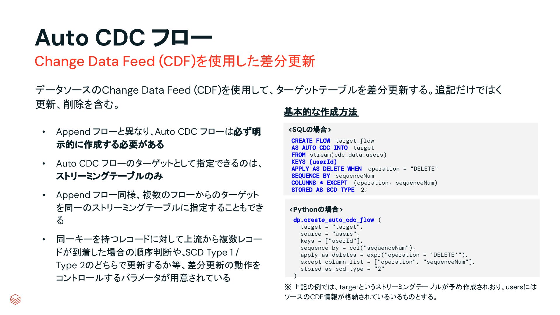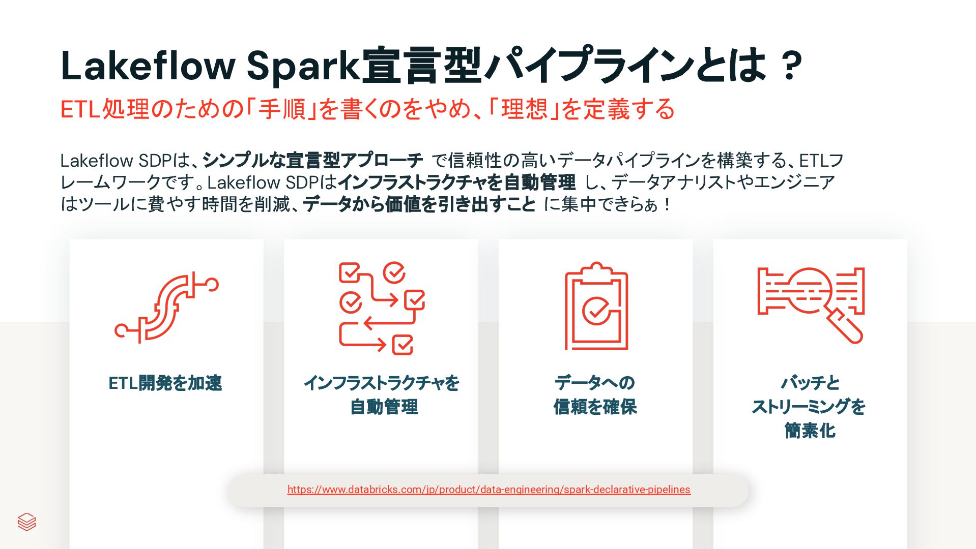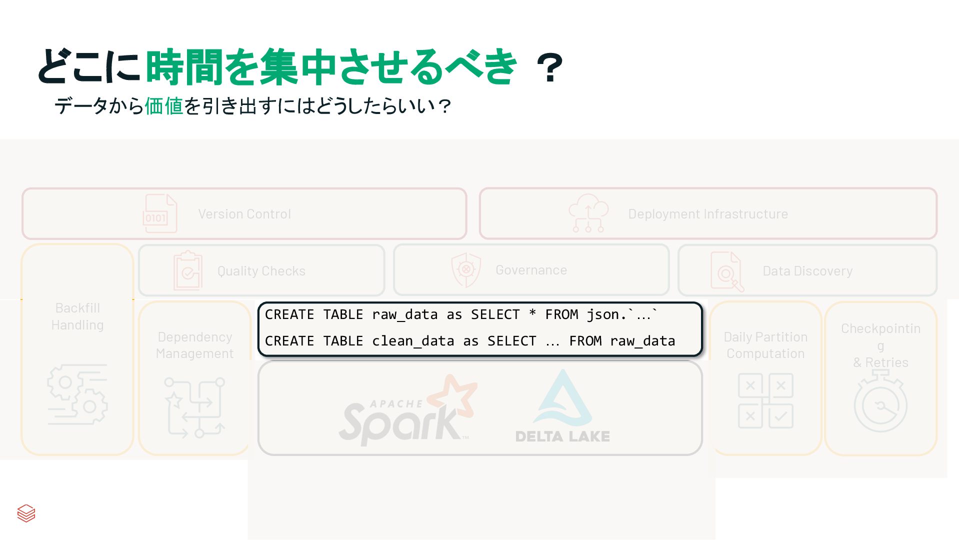 .table("bronze_events") \ .withWatermark("event_time", "30 minutes") # ウィンドウ集計 windowed = df.groupBy( window(col("event_time"), "10 minutes"), col("user_id") ).agg(sum("amount").alias("total")) def write_with_merge(batch_df, batch_id): batch_df.createOrReplaceTempView("updates") spark.sql(""" MERGE INTO gold_summary t USING updates s ON t.user_id = s.user_id AND t.window = s.window WHEN MATCHED THEN UPDATE SET total = s.total WHEN NOT MATCHED THEN INSERT * """) windowed.writeStream \ .foreachBatch(write_with_merge) \ .option("checkpointLocation", "/checkpoints/windowed") \ .outputMode("update") \ .start() CREATE OR REFRESH MATERIALIZED VIEW gold_summary AS SELECT window(event_time, '10 minutes') AS window, user_id, SUM(amount) AS total FROM STREAM(bronze_events) WITH WATERMARK ON event_time DELAY OF 30 MINUTES GROUP BY window(event_time, '10 minutes'), user_id; SDPだと?