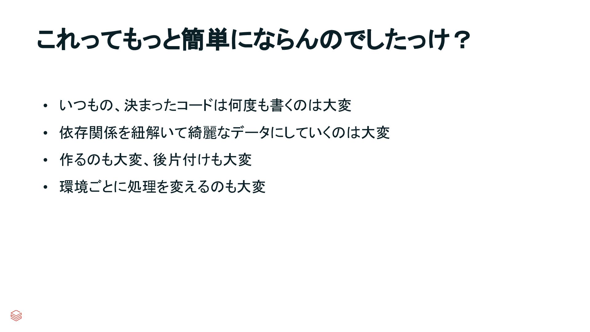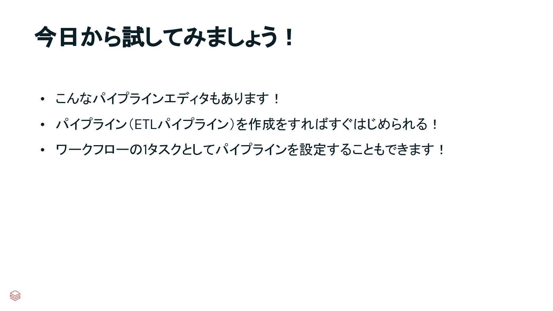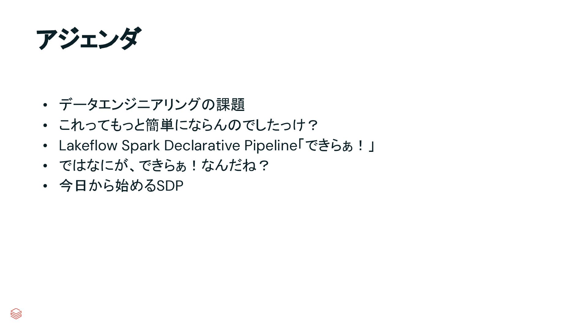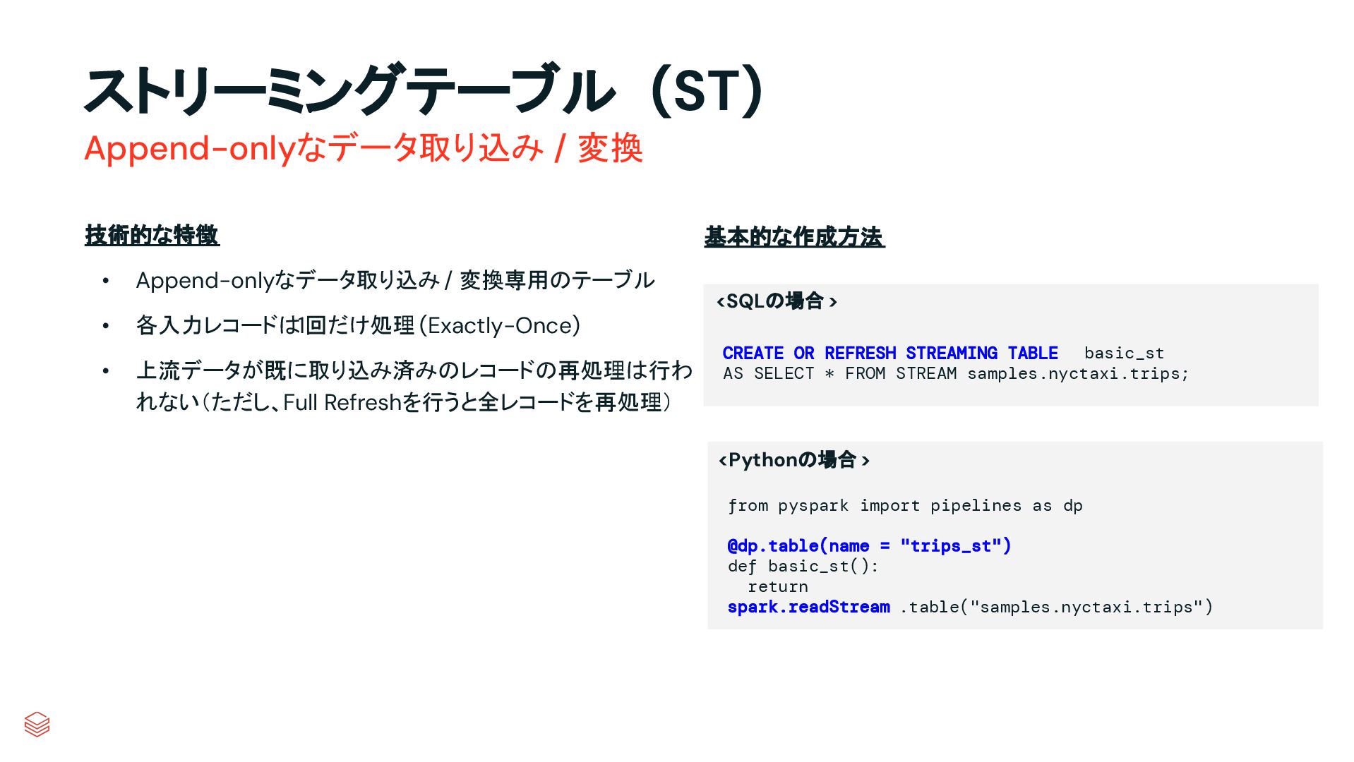 .table("bronze_events") \ .withWatermark("event_time", "30 minutes") # ウィンドウ集計 windowed = df.groupBy( window(col("event_time"), "10 minutes"), col("user_id") ).agg(sum("amount").alias("total")) def write_with_merge(batch_df, batch_id): batch_df.createOrReplaceTempView("updates") spark.sql(""" MERGE INTO gold_summary t USING updates s ON t.user_id = s.user_id AND t.window = s.window WHEN MATCHED THEN UPDATE SET total = s.total WHEN NOT MATCHED THEN INSERT * """) windowed.writeStream \ .foreachBatch(write_with_merge) \ .option("checkpointLocation", "/checkpoints/windowed") \ .outputMode("update") \ .start() CREATE OR REFRESH MATERIALIZED VIEW gold_summary AS SELECT window(event_time, '10 minutes') AS window, user_id, SUM(amount) AS total FROM STREAM(bronze_events) WITH WATERMARK ON event_time DELAY OF 30 MINUTES GROUP BY window(event_time, '10 minutes'), user_id; SDPだと?