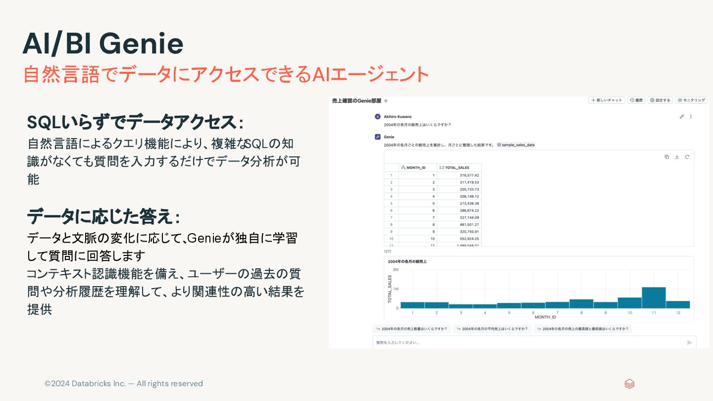 識がなくても質問を入力するだけでデータ分析が可 能 データに応じた答え: データと文脈の変化に応じて、 Genieが独自に学習 して質問に回答します コンテキスト認識機能を備え、ユーザーの過去の質 問や分析履歴を理解して、より関連性の高い結果を 提供 AI/BI Genie 自然言語でデータにアクセスできるAIエージェント
