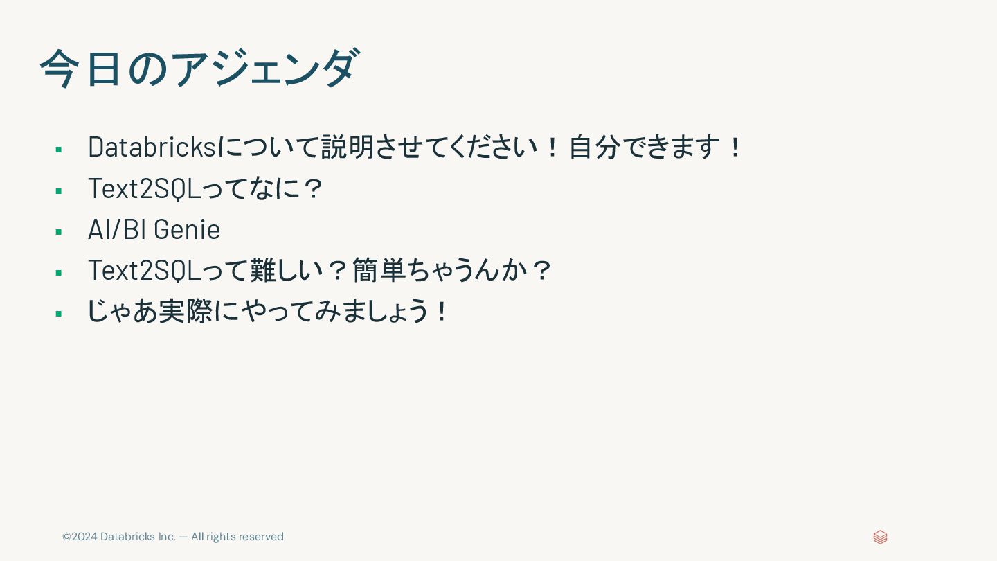 ▪ Text2SQLってなに? ▪ AI/BI Genie ▪ Text2SQLって難しい?簡単ちゃうんか? ▪ じゃあ実際にやってみましょう!