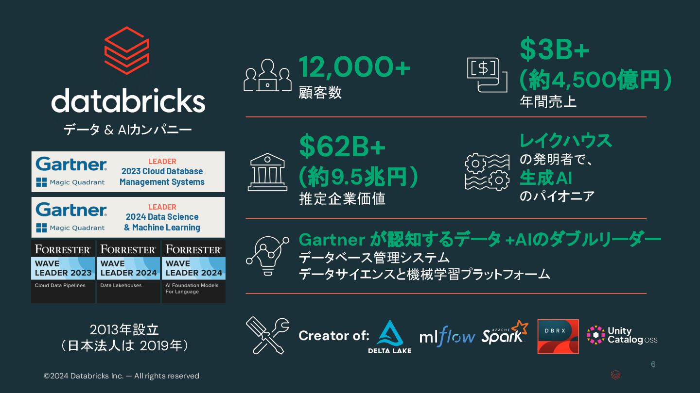 12,000+ 顧客数 $3B+ (約4,500億円) 年間売上 $62B+ (約9.5兆円) 推定企業価値 レイクハウス の発明者で、 生成AI のパイオニア Gartner が認知するデータ +AIのダブルリーダー データベース管理システム データサイエンスと機械学習プラットフォーム 2013年設立 (日本法人は 2019年) データ & AIカンパニー LEADER 2023 Cloud Database Management Systems LEADER 2024 Data Science & Machine Learning