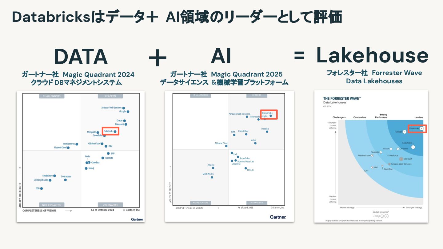 Quadrant 2025 データサイエンス &機械学習プラットフォーム Lakehouse + = フォレスター社 Forrester Wave Data Lakehouses Databricksはデータ+ AI領域のリーダーとして評価