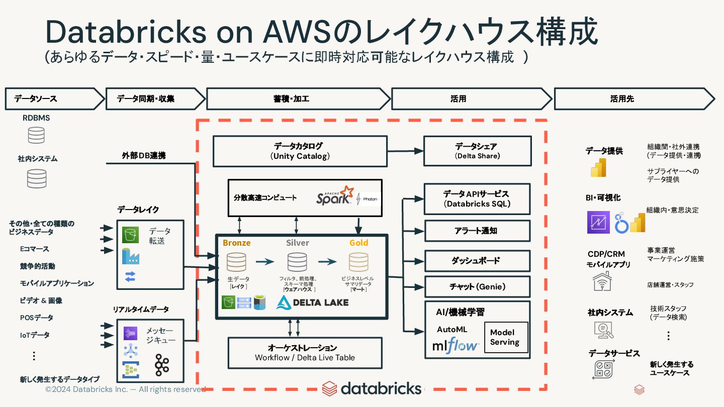 (あらゆるデータ・スピード・量・ユースケースに即時対応可能なレイクハウス構成 ) データ 転送 フィルタ、前処理、 スキーマ処理 [ウェアハウス ] Silver 生データ [レイク ] Bronze ビジネスレベル サマリデータ [マート ] Gold データカタログ (Unity Catalog) Model Serving データ APIサービス (Databricks SQL) データシェア (Delta Share) AI/機械学習 分散高速コンピュート データソース データ同期・収集 蓄積・加工 活用 活用先 競争的活動 モバイルアプリケーション POSデータ IoTデータ ビデオ & 画像 Eコマース メッセー ジキュー RDBMS 社内システム その他・全ての種類の ビジネスデータ リアルタイムデータ データレイク 新しく発生するデータタイプ ・・・ アラート通知 外部DB連携 オーケストレーション Workflow / Delta Live Table AutoML ダッシュボード CDP/CRM 組織間・社外連携 (データ提供・連携 ) データ提供 組織内・意思決定 技術スタッフ (データ検索) BI・可視化 サプライヤーへの データ提供 店舗運営・スタッフ モバイルアプリ 事業運営 マーケティング施策 新しく発生する ユースケース 社内システム データサービス ・・・ チャット (Genie)