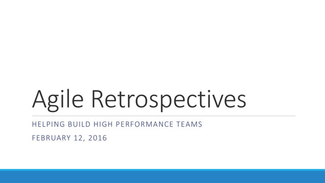 For me a High Performance Team is a group of people that work together to consistently meet and exceed both expectations and their commitments by delivering high quality results and only working 40 hours a week. It’s not magic and it’s not a fairy tale. It takes a lot of effort and hard work to develop a group of people that are able to work at this level. As part of the Agile Scrum process, the Retrospective Meeting is an outstanding tool that can help develop a High Performance Team. In this session we will explore the keys to retrospectives, how to plan an effective retrospective and provide specific topics and techniques to use.