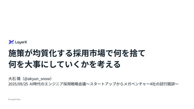 © LayerX Inc. 施策が均質化する採⽤市場で何を捨て 何を⼤事にしていくかを考える ⼤⽯ 陽(@akyun_snow) 2025/09/25 AI時代のエンジニア採⽤戦略会議〜スタートアップからメガベンチャー4社の試⾏錯誤〜