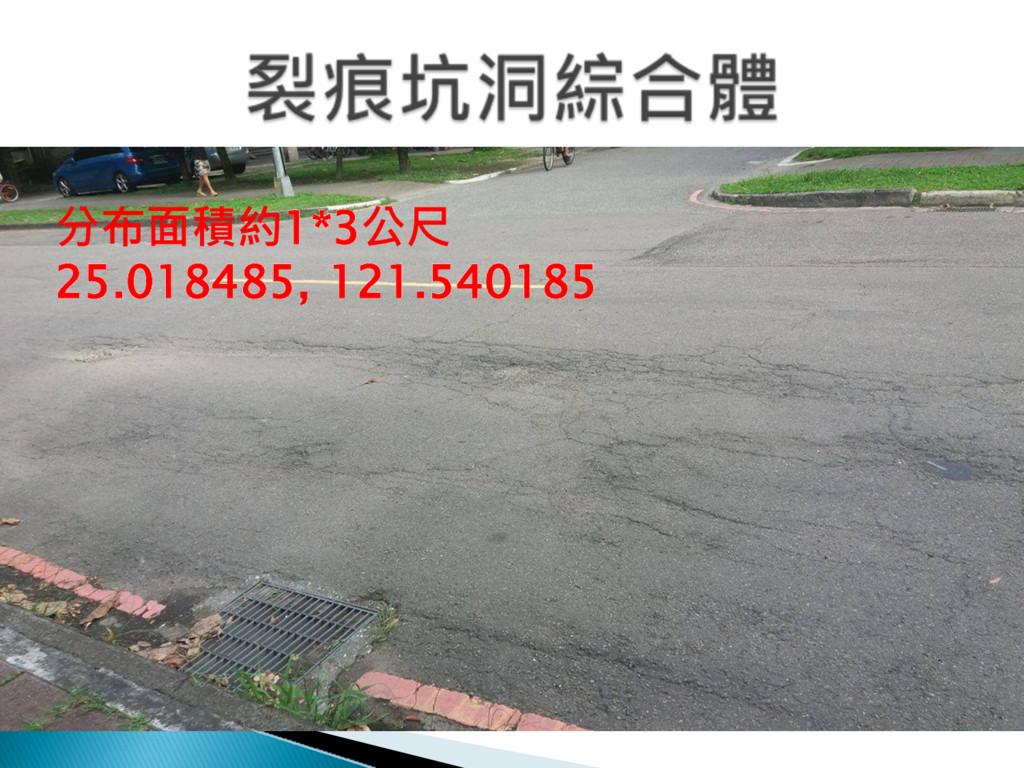 A 25.018470, 121.539607 • 深 約 三 公 分 • 本 體 坑 洞 分 布 面 積 約 三 十 *