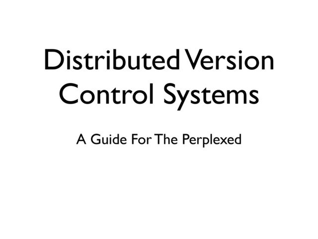 In this session you will learn what Distributed Version Control is, the benefits of DVCS, the primary DVCS platforms and their relative benefits and shortcomings. Much of the discussion around version control currently centers around Distributed Version Control Systems (DVCS). More tools, web sites and platforms continue to enable DVCS access and interaction. For many developers and teams, DVCS remains unfamiliar. This session aims to make attendees familiar with DVCS so they can make informed choices and begin deeper investigation of DVCS features and benefits.