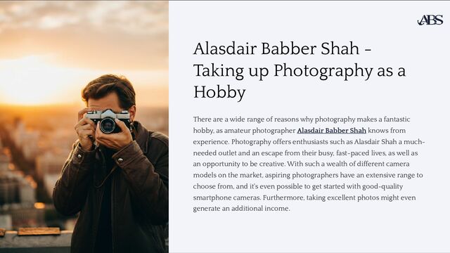 There are a wide range of reasons why photography makes a fantastic hobby, as amateur photographer Alasdair Babber Shah knows from experience. Photography offers enthusiasts such as Alasdair Shah a much-needed outlet and an escape from their busy, fast-paced lives, as well as an opportunity to be creative. With such a wealth of different camera models on the market, aspiring photographers have an extensive range to choose from, and it's even possible to get started with good-quality smartphone cameras. Furthermore, taking excellent photos might even generate an additional income.