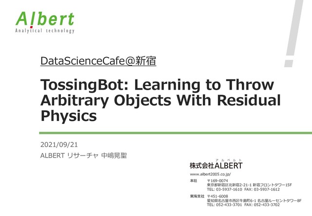 Throw Arbitrary Objects with Residual Physics Ø Robotics: Science and Systems (RSS) 2019 Best Systems Paper Award Ø Andy Zeng*1,*2, Shuran Song*1,*2,*3, Johnny Lee*2, Alberto Rodriguez*4, Thomas Funkhouser*1,*2 p *1: Princeton University、*2: Google、*3: Columbia University、*4: MIT