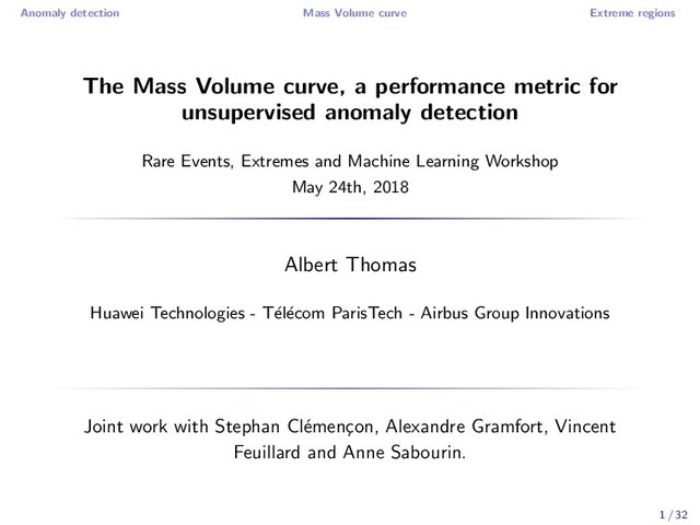 curve, a performance metric for unsupervised anomaly detection Rare Events, Extremes and Machine Learning Workshop May 24th, 2018 Albert Thomas Huawei Technologies - T´ el´ ecom ParisTech - Airbus Group Innovations Joint work with Stephan Cl´ emen¸ con, Alexandre Gramfort, Vincent Feuillard and Anne Sabourin. 1 / 32